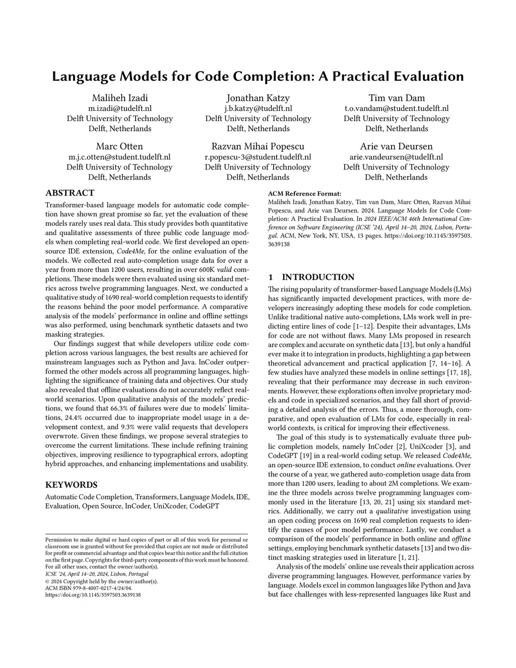 Transformer-based language models for automatic code completion have shown great promise so far, yet the evaluation of these models rarely uses real data. This study provides both quantitative and qualitative assessments of three public code language models when completing real-world code. We first developed an open-source IDE extension, Code4Me, for the online evaluation of the models. We collected real auto-completion usage data for over a year from more than 1200 users, resulting in over 600K valid completions. These models were then evaluated using six standard metrics across twelve programming languages. Next, we conducted a qualitative study of 1690 real-world completion requests to identify the reasons behind the poor model performance. A comparative analysis of the models' performance in online and offline settings was also performed, using benchmark synthetic datasets and two masking strategies. Our findings suggest that while developers utilize code completion across various languages, the best results are achieved for mainstream languages such as Python and Java. InCoder outperformed the other models across all programming languages, highlighting the significance of training data and objectives. Our study also revealed that offline evaluations do not accurately reflect real-world scenarios. Upon qualitative analysis of the model's predictions, we found that 66.3% of failures were due to the models' limitations, 24.4% occurred due to inappropriate model usage in a development context, and 9.3% were valid requests that developers overwrote. Given these findings, we propose several strategies to overcome the current limitations. These include refining training objectives, improving resilience to typographical errors, adopting hybrid approaches, and enhancing implementations and usability.