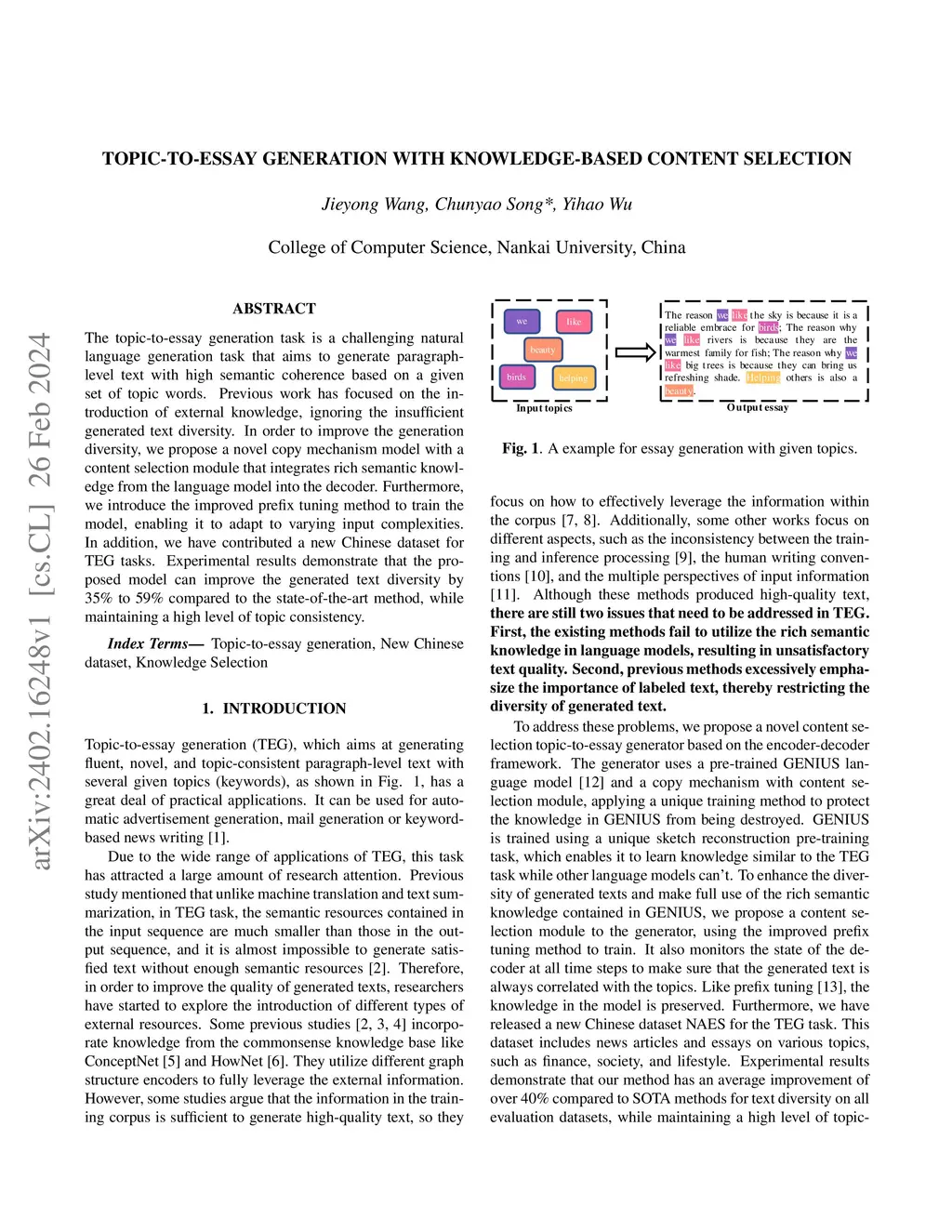 The topic-to-essay generation task is a challenging natural language generation task that aims to generate paragraph-level text with high semantic coherence based on a given set of topic words. Previous work has focused on the introduction of external knowledge, ignoring the insufficient generated text diversity. In order to improve the generation diversity, we propose a novel copy mechanism model with a content selection module that integrates rich semantic knowledge from the language model into the decoder. Furthermore, we introduce the improved prefix tuning method to train the model, enabling it to adapt to varying input complexities. In addition, we have contributed a new Chinese dataset for TEG tasks. Experimental results demonstrate that the proposed model can improve the generated text diversity by 35\% to 59\% compared to the state-of-the-art method, while maintaining a high level of topic consistency.