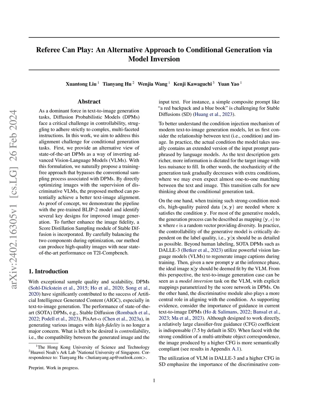 As a dominant force in text-to-image generation tasks, Diffusion Probabilistic Models (DPMs) face a critical challenge in controllability, struggling to adhere strictly to complex, multi-faceted instructions. In this work, we aim to address this alignment challenge for conditional generation tasks. First, we provide an alternative view of state-of-the-art DPMs as a way of inverting advanced Vision-Language Models (VLMs). With this formulation, we naturally propose a training-free approach that bypasses the conventional sampling process associated with DPMs. By directly optimizing images with the supervision of discriminative VLMs, the proposed method can potentially achieve a better text-image alignment. As proof of concept, we demonstrate the pipeline with the pre-trained BLIP-2 model and identify several key designs for improved image generation. To further enhance the image fidelity, a Score Distillation Sampling module of Stable Diffusion is incorporated. By carefully balancing the two components during optimization, our method can produce high-quality images with near state-of-the-art performance on T2I-Compbench.