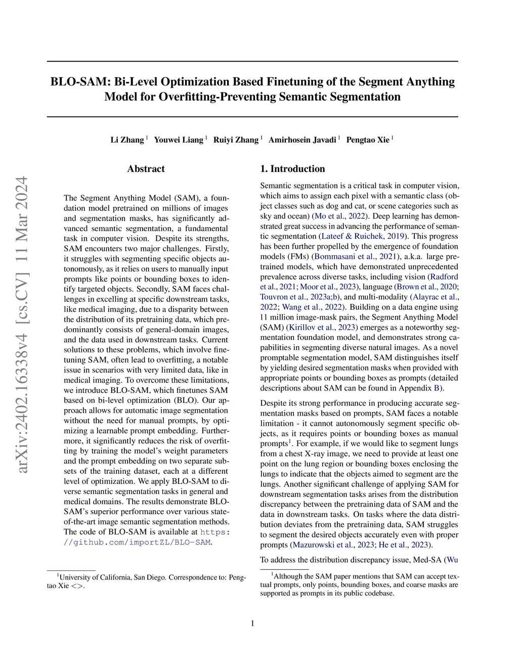 The Segment Anything Model (SAM), a foundation model pretrained on millions of images and segmentation masks, has significantly advanced semantic segmentation, a fundamental task in computer vision. Despite its strengths, SAM encounters two major challenges. Firstly, it struggles with segmenting specific objects autonomously, as it relies on users to manually input prompts like points or bounding boxes to identify targeted objects. Secondly, SAM faces challenges in excelling at specific downstream tasks, like medical imaging, due to a disparity between the distribution of its pretraining data, which predominantly consists of general-domain images, and the data used in downstream tasks. Current solutions to these problems, which involve finetuning SAM, often lead to overfitting, a notable issue in scenarios with very limited data, like in medical imaging. To overcome these limitations, we introduce BLO-SAM, which finetunes SAM based on bi-level optimization (BLO). Our approach allows for automatic image segmentation without the need for manual prompts, by optimizing a learnable prompt embedding. Furthermore, it significantly reduces the risk of overfitting by training the model's weight parameters and the prompt embedding on two separate subsets of the training dataset, each at a different level of optimization. We apply BLO-SAM to diverse semantic segmentation tasks in general and medical domains. The results demonstrate BLO-SAM's superior performance over various state-of-the-art image semantic segmentation methods.
