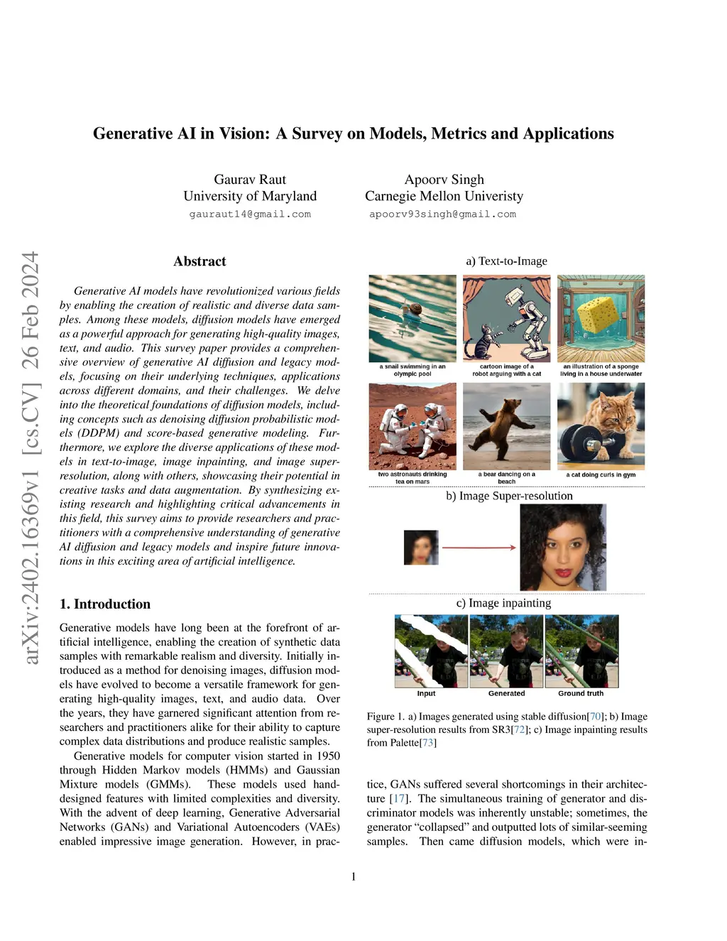 Generative AI models have revolutionized various fields by enabling the creation of realistic and diverse data samples. Among these models, diffusion models have emerged as a powerful approach for generating high-quality images, text, and audio. This survey paper provides a comprehensive overview of generative AI diffusion and legacy models, focusing on their underlying techniques, applications across different domains, and their challenges. We delve into the theoretical foundations of diffusion models, including concepts such as denoising diffusion probabilistic models (DDPM) and score-based generative modeling. Furthermore, we explore the diverse applications of these models in text-to-image, image inpainting, and image super-resolution, along with others, showcasing their potential in creative tasks and data augmentation. By synthesizing existing research and highlighting critical advancements in this field, this survey aims to provide researchers and practitioners with a comprehensive understanding of generative AI diffusion and legacy models and inspire future innovations in this exciting area of artificial intelligence.