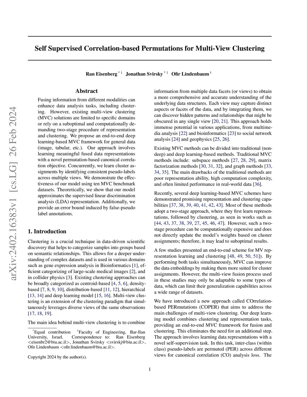 Self Supervised Correlation-based Permutations for Multi-View Clustering