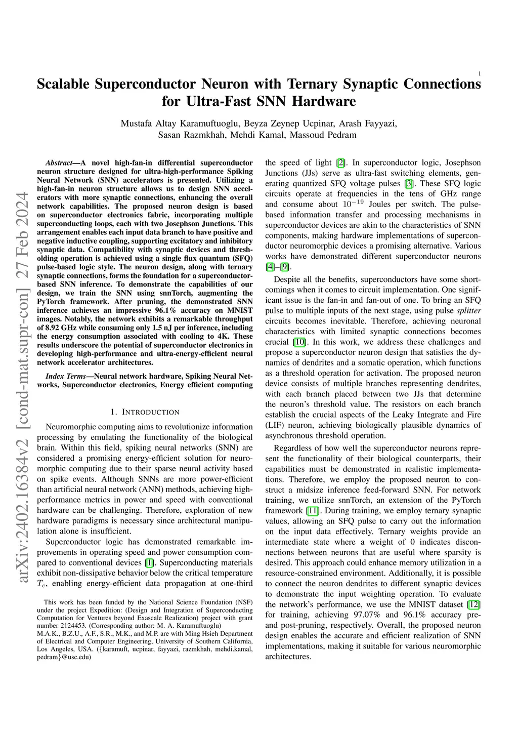 A novel high-fan-in differential superconductor neuron structure designed for ultra-high-performance Spiking Neural Network (SNN) accelerators is presented. Utilizing a high-fan-in neuron structure allows us to design SNN accelerators with more synaptic connections, enhancing the overall network capabilities. The proposed neuron design is based on superconductor electronics fabric, incorporating multiple superconducting loops, each with two Josephson Junctions. This arrangement enables each input data branch to have positive and negative inductive coupling, supporting excitatory and inhibitory synaptic data. Compatibility with synaptic devices and thresholding operation is achieved using a single flux quantum (SFQ) pulse-based logic style. The neuron design, along with ternary synaptic connections, forms the foundation for a superconductor-based SNN inference. To demonstrate the capabilities of our design, we train the SNN using snnTorch, augmenting the PyTorch framework. After pruning, the demonstrated SNN inference achieves an impressive 96.1% accuracy on MNIST images. Notably, the network exhibits a remarkable throughput of 8.92 GHz while consuming only 1.5 nJ per inference, including the energy consumption associated with cooling to 4K. These results underscore the potential of superconductor electronics in developing high-performance and ultra-energy-efficient neural network accelerator architectures.