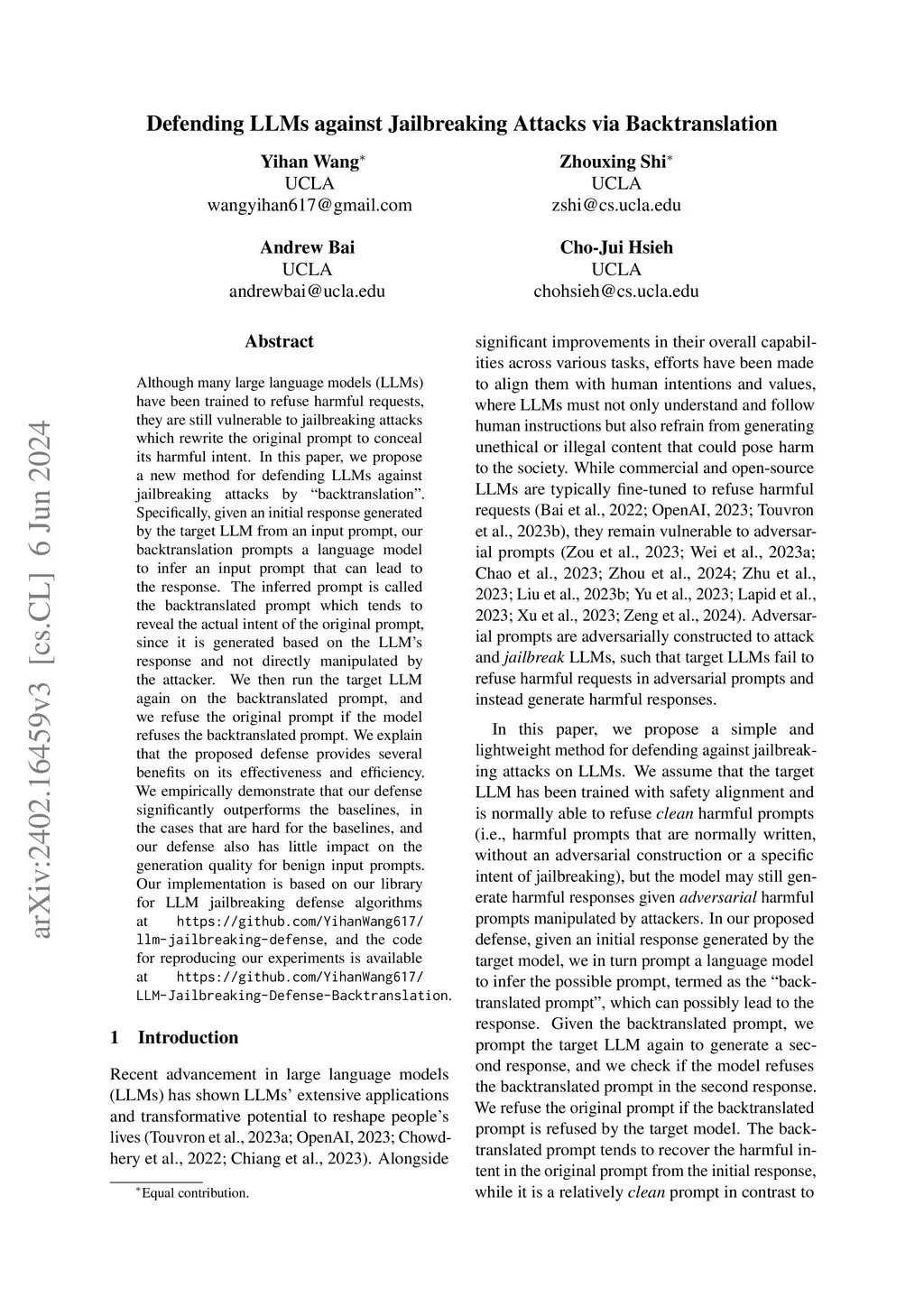 Although many large language models (LLMs) have been trained to refuse harmful requests, they are still vulnerable to jailbreaking attacks which rewrite the original prompt to conceal its harmful intent. In this paper, we propose a new method for defending LLMs against jailbreaking attacks by ``backtranslation''. Specifically, given an initial response generated by the target LLM from an input prompt, our backtranslation prompts a language model to infer an input prompt that can lead to the response. The inferred prompt is called the backtranslated prompt which tends to reveal the actual intent of the original prompt, since it is generated based on the LLM's response and not directly manipulated by the attacker. We then run the target LLM again on the backtranslated prompt, and we refuse the original prompt if the model refuses the backtranslated prompt. We explain that the proposed defense provides several benefits on its effectiveness and efficiency. We empirically demonstrate that our defense significantly outperforms the baselines, in the cases that are hard for the baselines, and our defense also has little impact on the generation quality for benign input prompts. Our implementation is based on our library for LLM jailbreaking defense algorithms at \url{https://github.com/YihanWang617/llm-jailbreaking-defense}, and the code for reproducing our experiments is available at \url{https://github.com/YihanWang617/LLM-Jailbreaking-Defense-Backtranslation}.