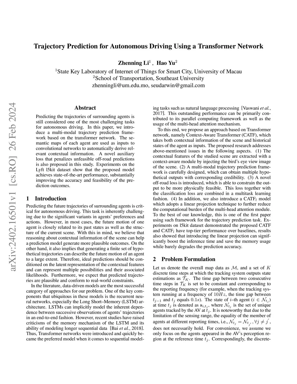 Predicting the trajectories of surrounding agents is still considered one of the most challenging tasks for autonomous driving. In this paper, we introduce a multi-modal trajectory prediction framework based on the transformer network. The semantic maps of each agent are used as inputs to convolutional networks to automatically derive relevant contextual information. A novel auxiliary loss that penalizes unfeasible off-road predictions is also proposed in this study. Experiments on the Lyft l5kit dataset show that the proposed model achieves state-of-the-art performance, substantially improving the accuracy and feasibility of the prediction outcomes.