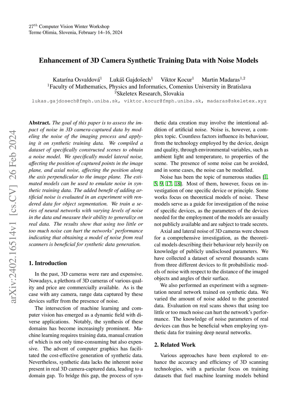 The goal of this paper is to assess the impact of noise in 3D camera-captured data by modeling the noise of the imaging process and applying it on synthetic training data. We compiled a dataset of specifically constructed scenes to obtain a noise model. We specifically model lateral noise, affecting the position of captured points in the image plane, and axial noise, affecting the position along the axis perpendicular to the image plane. The estimated models can be used to emulate noise in synthetic training data. The added benefit of adding artificial noise is evaluated in an experiment with rendered data for object segmentation. We train a series of neural networks with varying levels of noise in the data and measure their ability to generalize on real data. The results show that using too little or too much noise can hurt the networks' performance indicating that obtaining a model of noise from real scanners is beneficial for synthetic data generation.