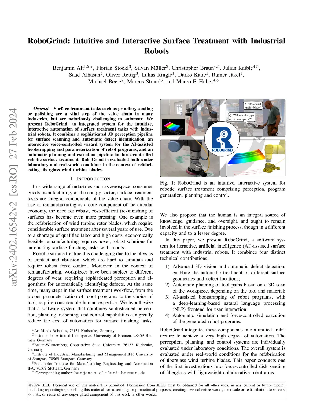 Surface treatment tasks such as grinding, sanding or polishing are a vital step of the value chain in many industries, but are notoriously challenging to automate. We present RoboGrind, an integrated system for the intuitive, interactive automation of surface treatment tasks with industrial robots. It combines a sophisticated 3D perception pipeline for surface scanning and automatic defect identification, an interactive voice-controlled wizard system for the AI-assisted bootstrapping and parameterization of robot programs, and an automatic planning and execution pipeline for force-controlled robotic surface treatment. RoboGrind is evaluated both under laboratory and real-world conditions in the context of refabricating fiberglass wind turbine blades.