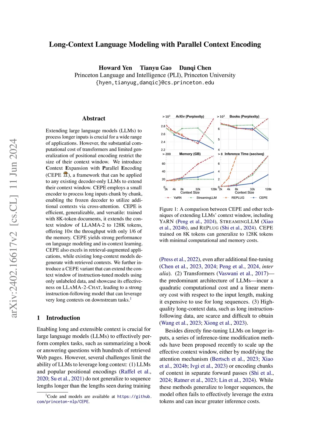 Extending large language models (LLMs) to process longer inputs is crucial for a wide range of applications. However, the substantial computational cost of transformers and limited generalization of positional encoding restrict the size of their context window. We introduce Context Expansion with Parallel Encoding (CEPE), a framework that can be applied to any existing decoder-only LLMs to extend their context window. CEPE employs a small encoder to process long inputs chunk by chunk, enabling the frozen decoder to utilize additional contexts via cross-attention. CEPE is efficient, generalizable, and versatile: trained with 8K-token documents, it extends the context window of LLAMA-2 to 128K tokens, offering 10x the throughput with only 1/6 of the memory. CEPE yields strong performance on language modeling and in-context learning. CEPE also excels in retrieval-augmented applications, while existing long-context models degenerate with retrieved contexts. We further introduce a CEPE variant that can extend the context window of instruction-tuned models using only unlabeled data, and showcase its effectiveness on LLAMA-2-CHAT, leading to a strong instruction-following model that can leverage very long contexts on downstream tasks.