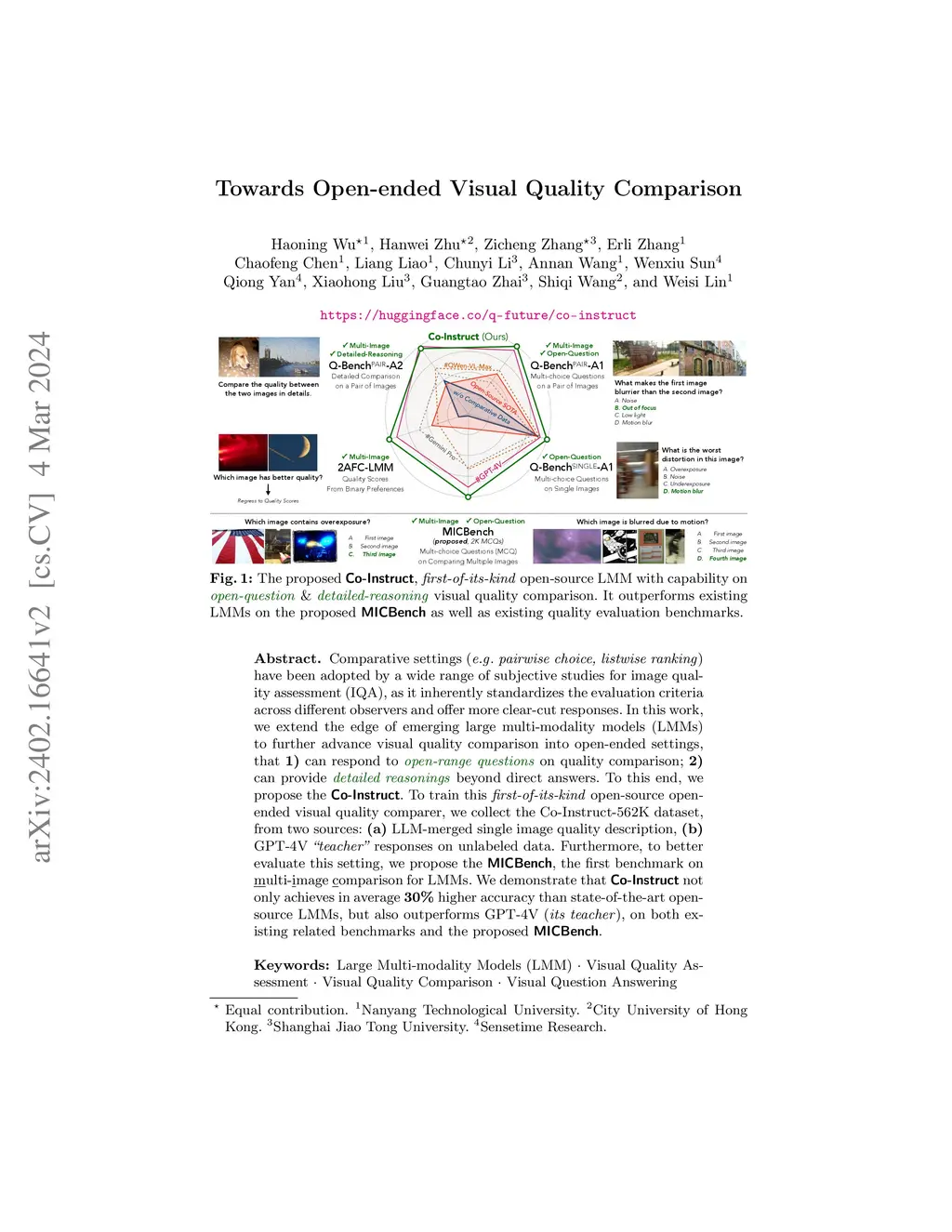 Comparative settings (e.g. pairwise choice, listwise ranking) have been adopted by a wide range of subjective studies for image quality assessment (IQA), as it inherently standardizes the evaluation criteria across different observers and offer more clear-cut responses. In this work, we extend the edge of emerging large multi-modality models (LMMs) to further advance visual quality comparison into open-ended settings, that 1) can respond to open-range questions on quality comparison; 2) can provide detailed reasonings beyond direct answers. To this end, we propose the Co-Instruct. To train this first-of-its-kind open-source open-ended visual quality comparer, we collect the Co-Instruct-562K dataset, from two sources: (a) LLM-merged single image quality description, (b) GPT-4V "teacher" responses on unlabeled data. Furthermore, to better evaluate this setting, we propose the MICBench, the first benchmark on multi-image comparison for LMMs. We demonstrate that Co-Instruct not only achieves in average 30% higher accuracy than state-of-the-art open-source LMMs, but also outperforms GPT-4V (its teacher), on both existing related benchmarks and the proposed MICBench. Our model is published at https://huggingface.co/q-future/co-instruct.