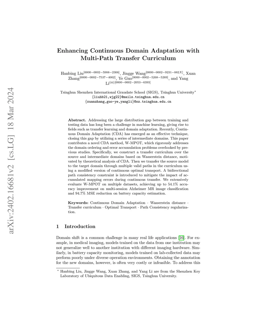 Addressing the large distribution gap between training and testing data has long been a challenge in machine learning, giving rise to fields such as transfer learning and domain adaptation. Recently, Continuous Domain Adaptation (CDA) has emerged as an effective technique, closing this gap by utilizing a series of intermediate domains. This paper contributes a novel CDA method, W-MPOT, which rigorously addresses the domain ordering and error accumulation problems overlooked by previous studies. Specifically, we construct a transfer curriculum over the source and intermediate domains based on Wasserstein distance, motivated by theoretical analysis of CDA. Then we transfer the source model to the target domain through multiple valid paths in the curriculum using a modified version of continuous optimal transport. A bidirectional path consistency constraint is introduced to mitigate the impact of accumulated mapping errors during continuous transfer. We extensively evaluate W-MPOT on multiple datasets, achieving up to 54.1\% accuracy improvement on multi-session Alzheimer MR image classification and 94.7\% MSE reduction on battery capacity estimation.