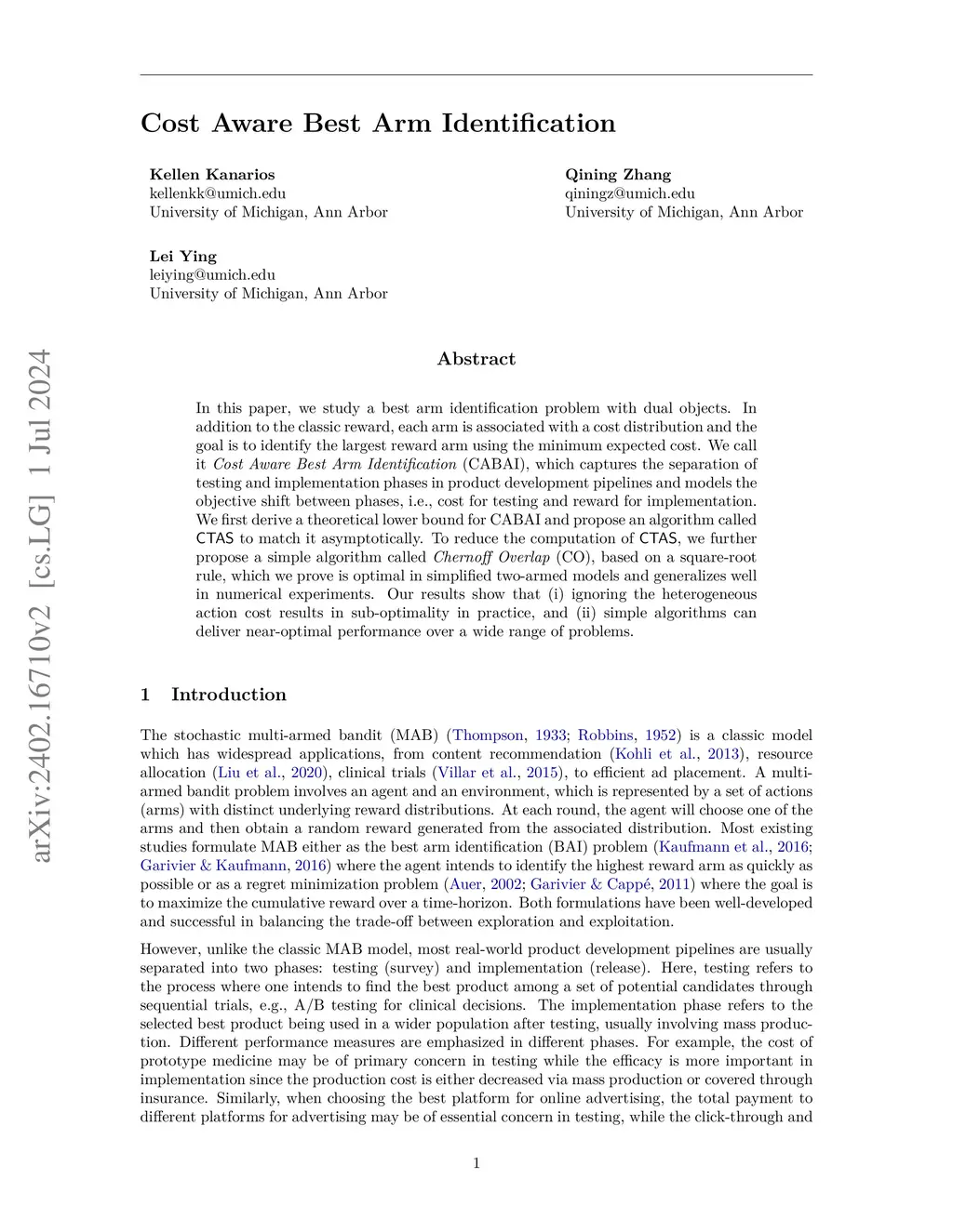 In this paper, we study a best arm identification problem with dual objects. In addition to the classic reward, each arm is associated with a cost distribution and the goal is to identify the largest reward arm using the minimum expected cost. We call it \emph{Cost Aware Best Arm Identification} (CABAI), which captures the separation of testing and implementation phases in product development pipelines and models the objective shift between phases, i.e., cost for testing and reward for implementation. We first derive a theoretical lower bound for CABAI and propose an algorithm called to match it asymptotically. To reduce the computation of , we further propose a simple algorithm called \emph{Chernoff Overlap} (CO), based on a square-root rule, which we prove is optimal in simplified two-armed models and generalizes well in numerical experiments. Our results show that (i) ignoring the heterogeneous action cost results in sub-optimality in practice, and (ii) simple algorithms can deliver near-optimal performance over a wide range of problems.
