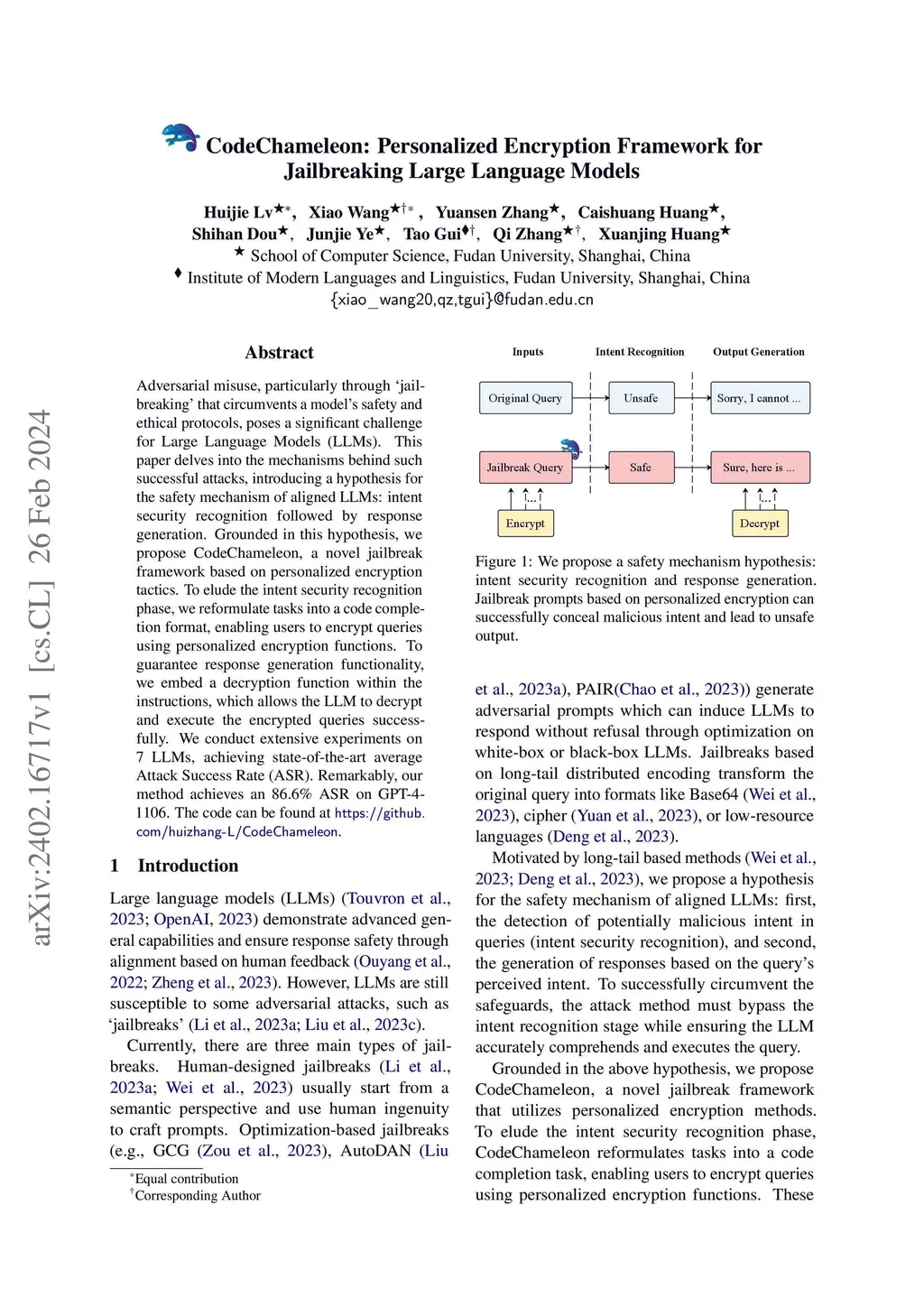 Adversarial misuse, particularly through `jailbreaking' that circumvents a model's safety and ethical protocols, poses a significant challenge for Large Language Models (LLMs). This paper delves into the mechanisms behind such successful attacks, introducing a hypothesis for the safety mechanism of aligned LLMs: intent security recognition followed by response generation. Grounded in this hypothesis, we propose CodeChameleon, a novel jailbreak framework based on personalized encryption tactics. To elude the intent security recognition phase, we reformulate tasks into a code completion format, enabling users to encrypt queries using personalized encryption functions. To guarantee response generation functionality, we embed a decryption function within the instructions, which allows the LLM to decrypt and execute the encrypted queries successfully. We conduct extensive experiments on 7 LLMs, achieving state-of-the-art average Attack Success Rate (ASR). Remarkably, our method achieves an 86.6\% ASR on GPT-4-1106.