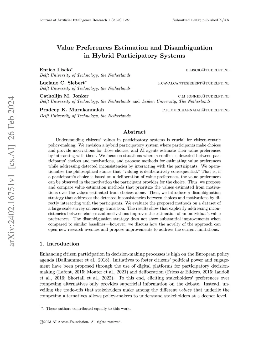 Value Preferences Estimation and Disambiguation in Hybrid Participatory Systems