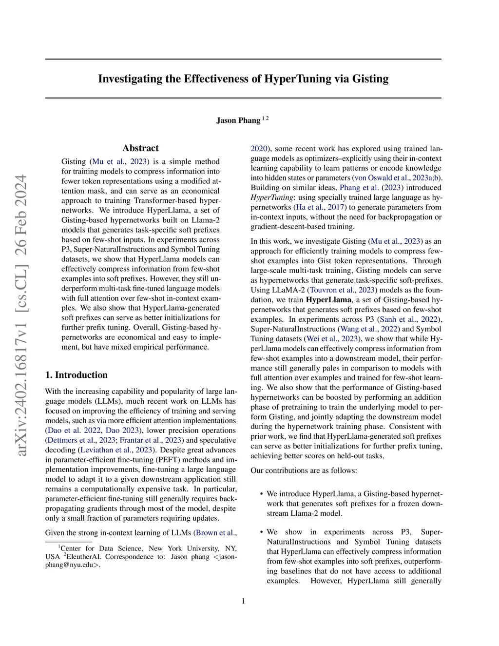 Gisting (Mu et al., 2023) is a simple method for training models to compress information into fewer token representations using a modified attention mask, and can serve as an economical approach to training Transformer-based hypernetworks. We introduce HyperLlama, a set of Gisting-based hypernetworks built on Llama-2 models that generates task-specific soft prefixes based on few-shot inputs. In experiments across P3, Super-NaturalInstructions and Symbol Tuning datasets, we show that HyperLlama models can effectively compress information from few-shot examples into soft prefixes. However, they still underperform multi-task fine-tuned language models with full attention over few-shot in-context examples. We also show that HyperLlama-generated soft prefixes can serve as better initializations for further prefix tuning. Overall, Gisting-based hypernetworks are economical and easy to implement, but have mixed empirical performance.