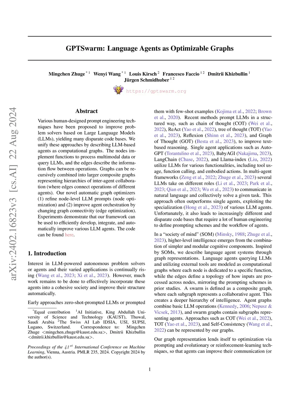 Various human-designed prompt engineering techniques have been proposed to improve problem solvers based on Large Language Models (LLMs), yielding many disparate code bases. We unify these approaches by describing LLM-based agents as computational graphs. The nodes implement functions to process multimodal data or query LLMs, and the edges describe the information flow between operations. Graphs can be recursively combined into larger composite graphs representing hierarchies of inter-agent collaboration (where edges connect operations of different agents). Our novel automatic graph optimizers (1) refine node-level LLM prompts (node optimization) and (2) improve agent orchestration by changing graph connectivity (edge optimization). Experiments demonstrate that our framework can be used to efficiently develop, integrate, and automatically improve various LLM agents. The code can be found at https://github.com/metauto-ai/gptswarm.
