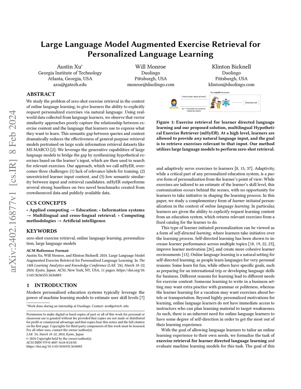 We study the problem of zero-shot exercise retrieval in the context of online language learning, to give learners the ability to explicitly request personalized exercises via natural language. Using real-world data collected from language learners, we observe that vector similarity approaches poorly capture the relationship between exercise content and the language that learners use to express what they want to learn. This semantic gap between queries and content dramatically reduces the effectiveness of general-purpose retrieval models pretrained on large scale information retrieval datasets like MS MARCO. We leverage the generative capabilities of large language models to bridge the gap by synthesizing hypothetical exercises based on the learner's input, which are then used to search for relevant exercises. Our approach, which we call mHyER, overcomes three challenges: (1) lack of relevance labels for training, (2) unrestricted learner input content, and (3) low semantic similarity between input and retrieval candidates. mHyER outperforms several strong baselines on two novel benchmarks created from crowdsourced data and publicly available data.