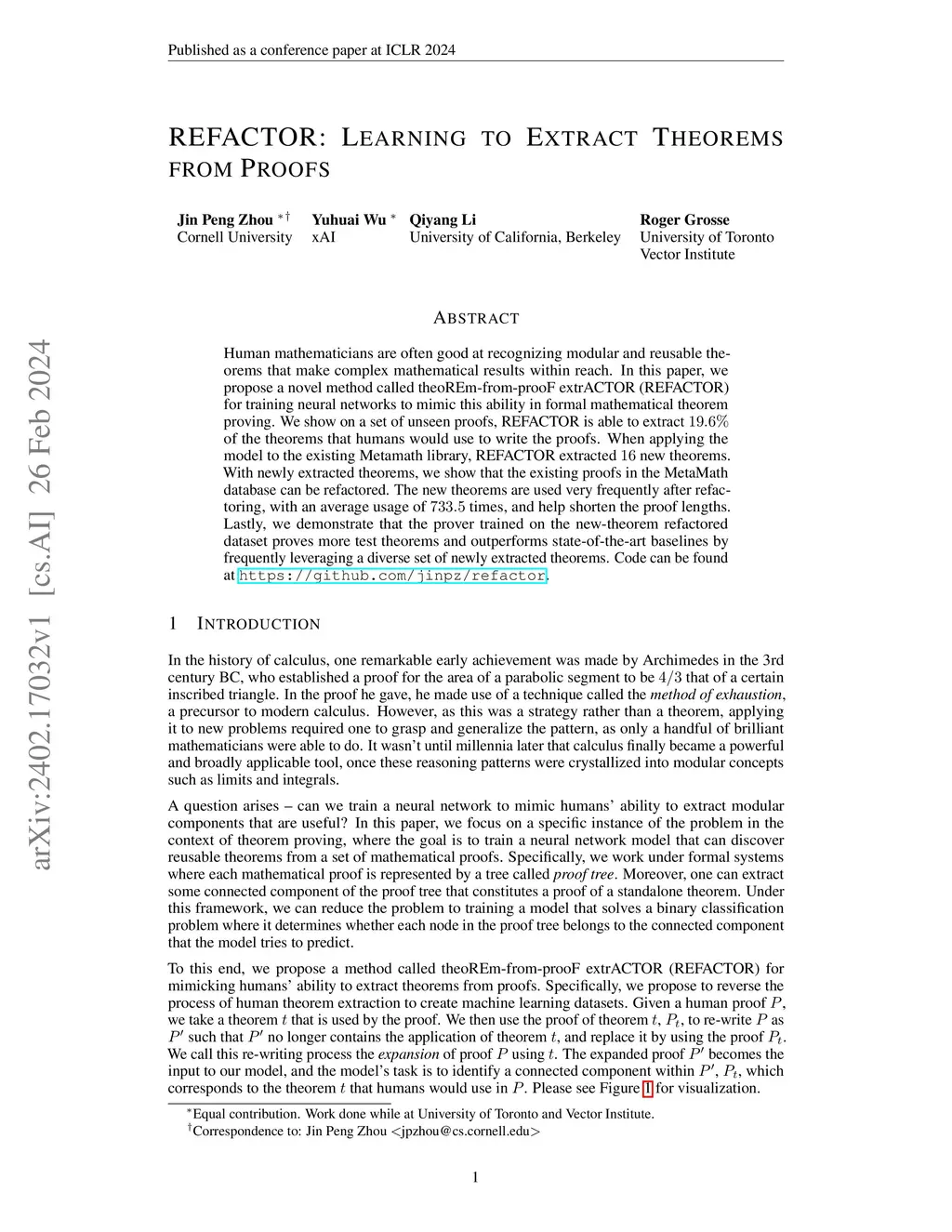 Human mathematicians are often good at recognizing modular and reusable theorems that make complex mathematical results within reach. In this paper, we propose a novel method called theoREm-from-prooF extrACTOR (REFACTOR) for training neural networks to mimic this ability in formal mathematical theorem proving. We show on a set of unseen proofs, REFACTOR is able to extract 19.6% of the theorems that humans would use to write the proofs. When applying the model to the existing Metamath library, REFACTOR extracted 16 new theorems. With newly extracted theorems, we show that the existing proofs in the MetaMath database can be refactored. The new theorems are used very frequently after refactoring, with an average usage of 733.5 times, and help shorten the proof lengths. Lastly, we demonstrate that the prover trained on the new-theorem refactored dataset proves more test theorems and outperforms state-of-the-art baselines by frequently leveraging a diverse set of newly extracted theorems. Code can be found at https://github.com/jinpz/refactor.