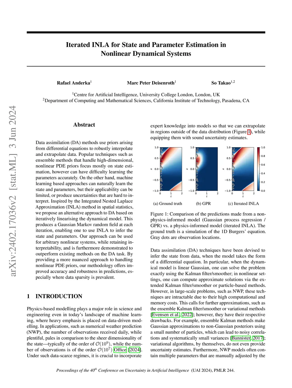 Data assimilation (DA) methods use priors arising from differential equations to robustly interpolate and extrapolate data. Popular techniques such as ensemble methods that handle high-dimensional, nonlinear PDE priors focus mostly on state estimation, however can have difficulty learning the parameters accurately. On the other hand, machine learning based approaches can naturally learn the state and parameters, but their applicability can be limited, or produce uncertainties that are hard to interpret. Inspired by the Integrated Nested Laplace Approximation (INLA) method in spatial statistics, we propose an alternative approach to DA based on iteratively linearising the dynamical model. This produces a Gaussian Markov random field at each iteration, enabling one to use INLA to infer the state and parameters. Our approach can be used for arbitrary nonlinear systems, while retaining interpretability, and is furthermore demonstrated to outperform existing methods on the DA task. By providing a more nuanced approach to handling nonlinear PDE priors, our methodology offers improved accuracy and robustness in predictions, especially where data sparsity is prevalent.