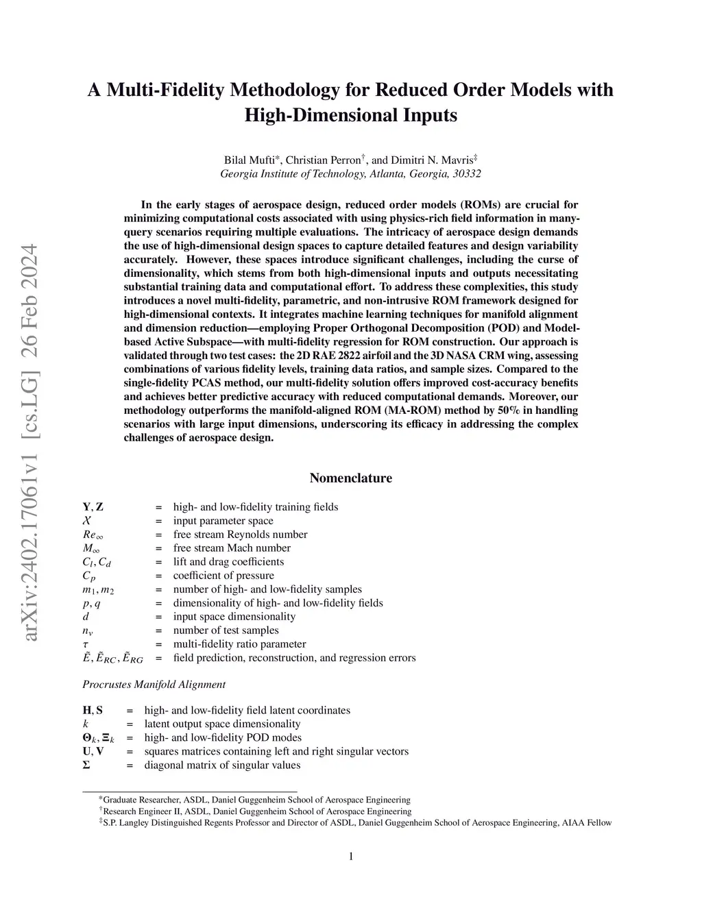 In the early stages of aerospace design, reduced order models (ROMs) are crucial for minimizing computational costs associated with using physics-rich field information in many-query scenarios requiring multiple evaluations. The intricacy of aerospace design demands the use of high-dimensional design spaces to capture detailed features and design variability accurately. However, these spaces introduce significant challenges, including the curse of dimensionality, which stems from both high-dimensional inputs and outputs necessitating substantial training data and computational effort. To address these complexities, this study introduces a novel multi-fidelity, parametric, and non-intrusive ROM framework designed for high-dimensional contexts. It integrates machine learning techniques for manifold alignment and dimension reduction employing Proper Orthogonal Decomposition (POD) and Model-based Active Subspace with multi-fidelity regression for ROM construction. Our approach is validated through two test cases: the 2D RAE~2822 airfoil and the 3D NASA CRM wing, assessing combinations of various fidelity levels, training data ratios, and sample sizes. Compared to the single-fidelity PCAS method, our multi-fidelity solution offers improved cost-accuracy benefits and achieves better predictive accuracy with reduced computational demands. Moreover, our methodology outperforms the manifold-aligned ROM (MA-ROM) method by 50% in handling scenarios with large input dimensions, underscoring its efficacy in addressing the complex challenges of aerospace design.