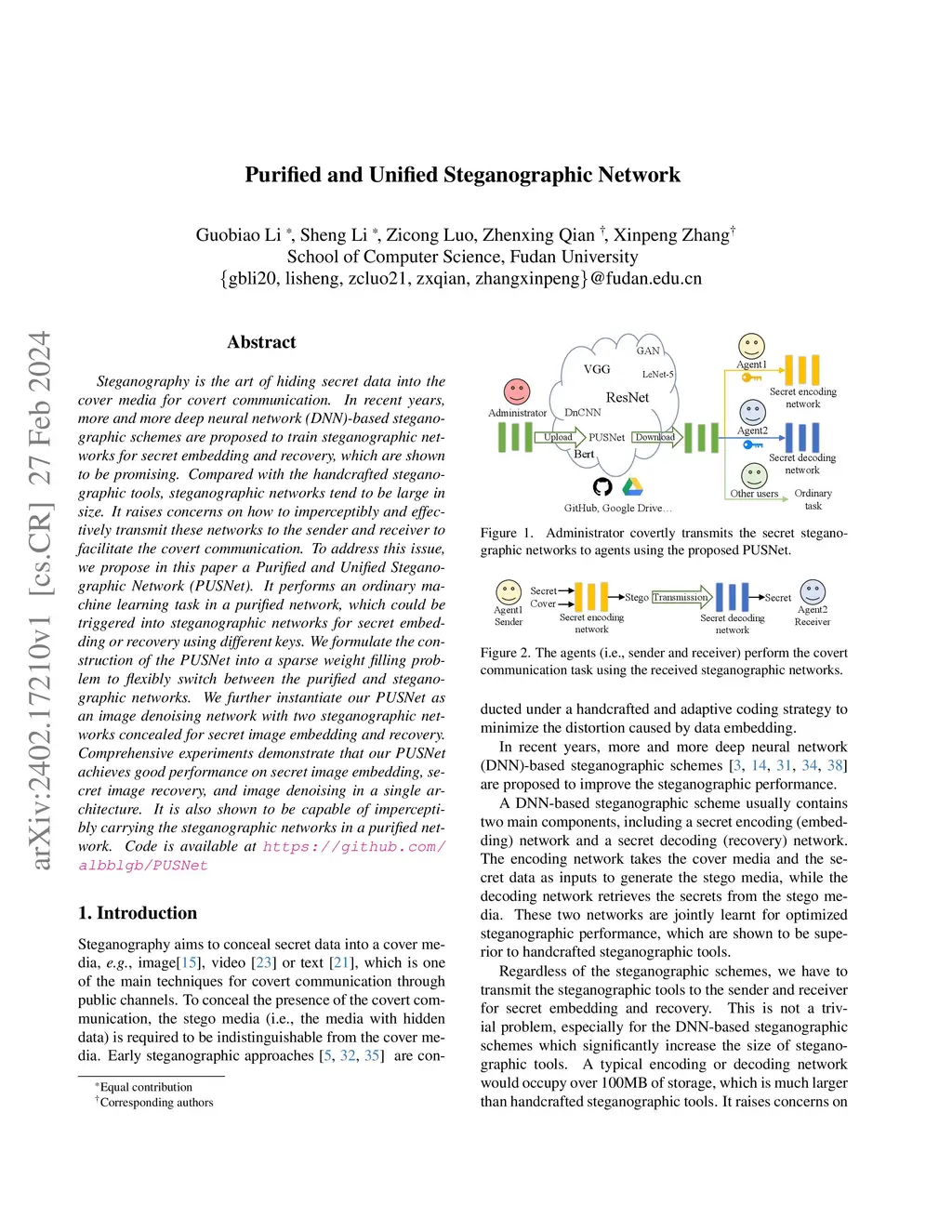 Steganography is the art of hiding secret data into the cover media for covert communication. In recent years, more and more deep neural network (DNN)-based steganographic schemes are proposed to train steganographic networks for secret embedding and recovery, which are shown to be promising. Compared with the handcrafted steganographic tools, steganographic networks tend to be large in size. It raises concerns on how to imperceptibly and effectively transmit these networks to the sender and receiver to facilitate the covert communication. To address this issue, we propose in this paper a Purified and Unified Steganographic Network (PUSNet). It performs an ordinary machine learning task in a purified network, which could be triggered into steganographic networks for secret embedding or recovery using different keys. We formulate the construction of the PUSNet into a sparse weight filling problem to flexibly switch between the purified and steganographic networks. We further instantiate our PUSNet as an image denoising network with two steganographic networks concealed for secret image embedding and recovery. Comprehensive experiments demonstrate that our PUSNet achieves good performance on secret image embedding, secret image recovery, and image denoising in a single architecture. It is also shown to be capable of imperceptibly carrying the steganographic networks in a purified network. Code is available at \url{https://github.com/albblgb/PUSNet}