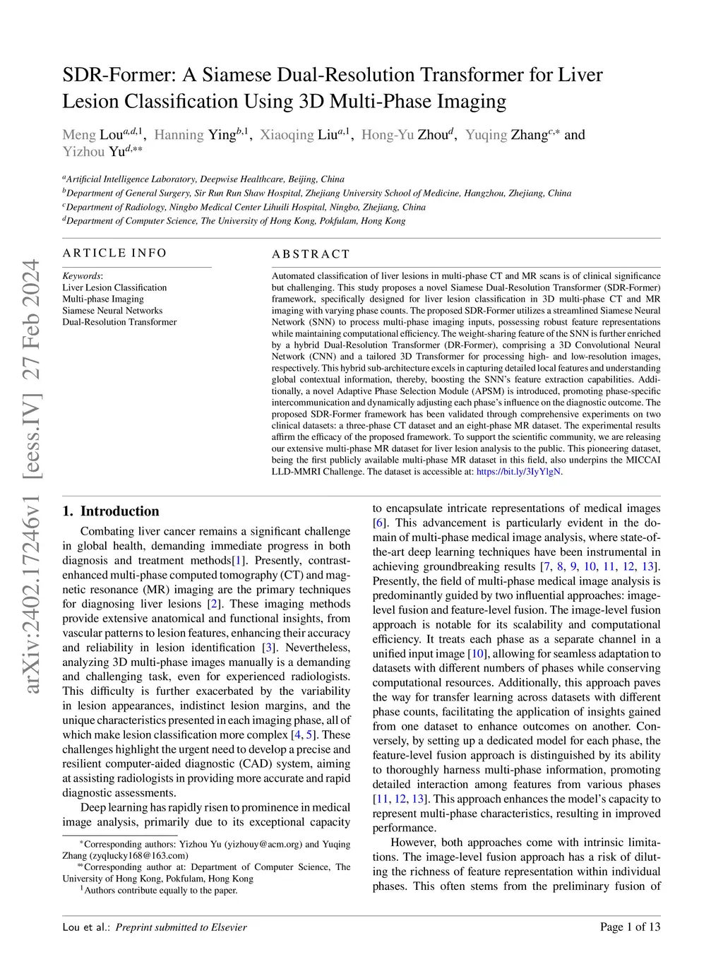 SDR-Former: A Siamese Dual-Resolution Transformer for Liver Lesion
