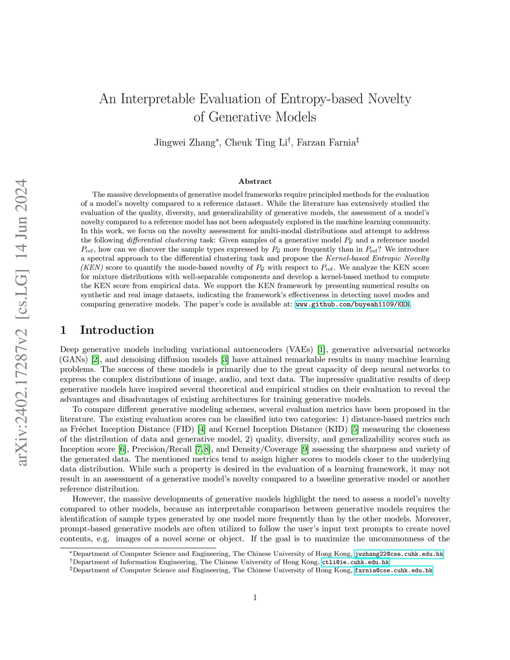 The massive developments of generative model frameworks require principled methods for the evaluation of a model's novelty compared to a reference dataset. While the literature has extensively studied the evaluation of the quality, diversity, and generalizability of generative models, the assessment of a model's novelty compared to a reference model has not been adequately explored in the machine learning community. In this work, we focus on the novelty assessment for multi-modal distributions and attempt to address the following differential clustering task: Given samples of a generative model and a reference model , how can we discover the sample types expressed by more frequently than in ? We introduce a spectral approach to the differential clustering task and propose the Kernel-based Entropic Novelty (KEN) score to quantify the mode-based novelty of with respect to . We analyze the KEN score for mixture distributions with well-separable components and develop a kernel-based method to compute the KEN score from empirical data. We support the KEN framework by presenting numerical results on synthetic and real image datasets, indicating the framework's effectiveness in detecting novel modes and comparing generative models. The paper's code is available at: www.github.com/buyeah1109/KEN