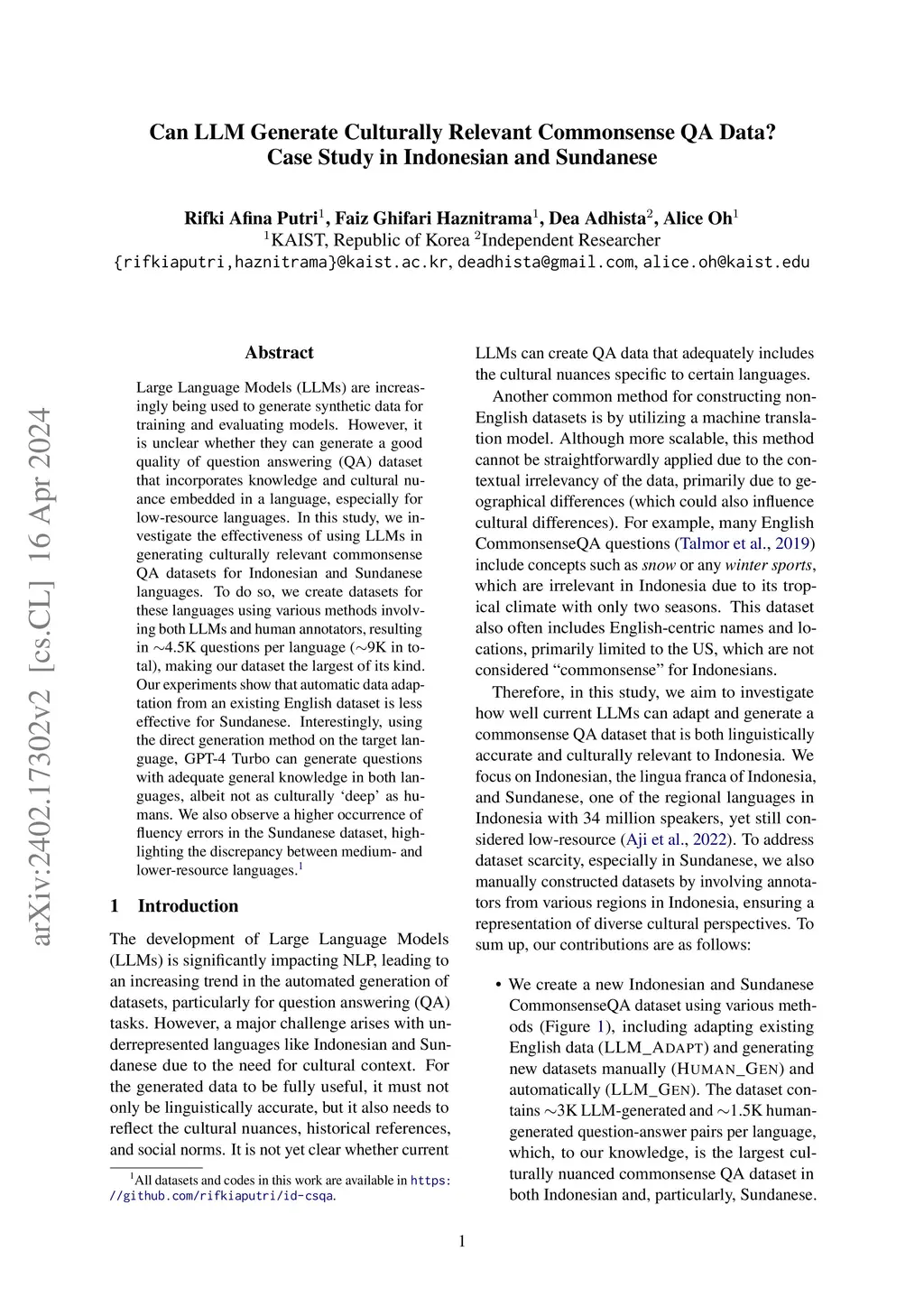 Large Language Models (LLMs) are increasingly being used to generate synthetic data for training and evaluating models. However, it is unclear whether they can generate a good quality of question answering (QA) dataset that incorporates knowledge and cultural nuance embedded in a language, especially for low-resource languages. In this study, we investigate the effectiveness of using LLMs in generating culturally relevant commonsense QA datasets for Indonesian and Sundanese languages. To do so, we create datasets for these languages using various methods involving both LLMs and human annotators. Our experiments show that the current best-performing LLM, GPT-4 Turbo, is capable of generating questions with adequate knowledge in Indonesian but not in Sundanese, highlighting the performance discrepancy between medium- and lower-resource languages. We also benchmark various LLMs on our generated datasets and find that they perform better on the LLM-generated datasets compared to those created by humans.