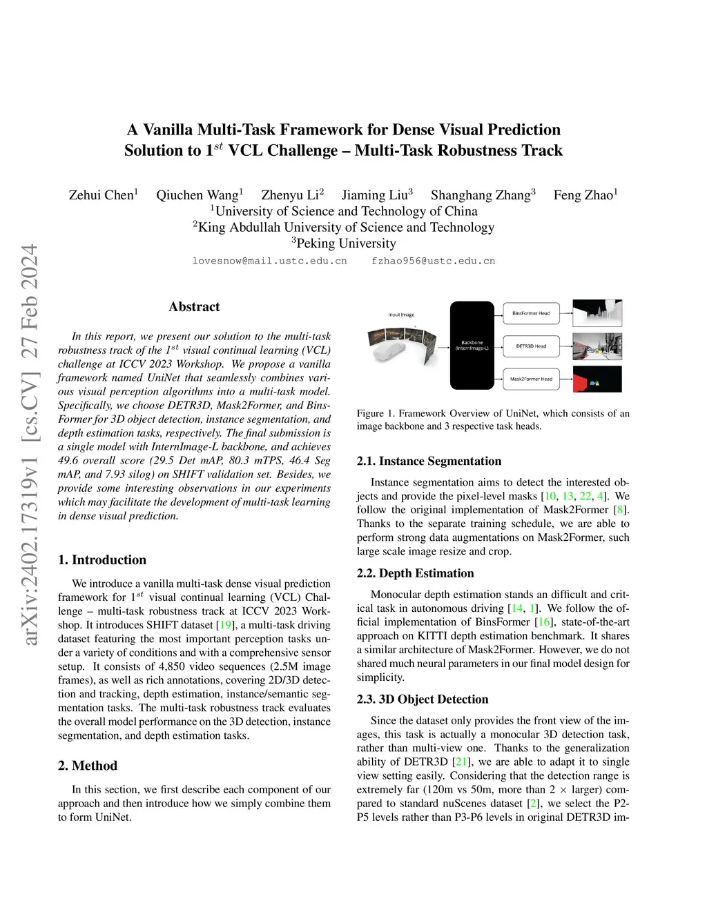 In this report, we present our solution to the multi-task robustness track of the 1st Visual Continual Learning (VCL) Challenge at ICCV 2023 Workshop. We propose a vanilla framework named UniNet that seamlessly combines various visual perception algorithms into a multi-task model. Specifically, we choose DETR3D, Mask2Former, and BinsFormer for 3D object detection, instance segmentation, and depth estimation tasks, respectively. The final submission is a single model with InternImage-L backbone, and achieves a 49.6 overall score (29.5 Det mAP, 80.3 mTPS, 46.4 Seg mAP, and 7.93 silog) on SHIFT validation set. Besides, we provide some interesting observations in our experiments which may facilitate the development of multi-task learning in dense visual prediction.