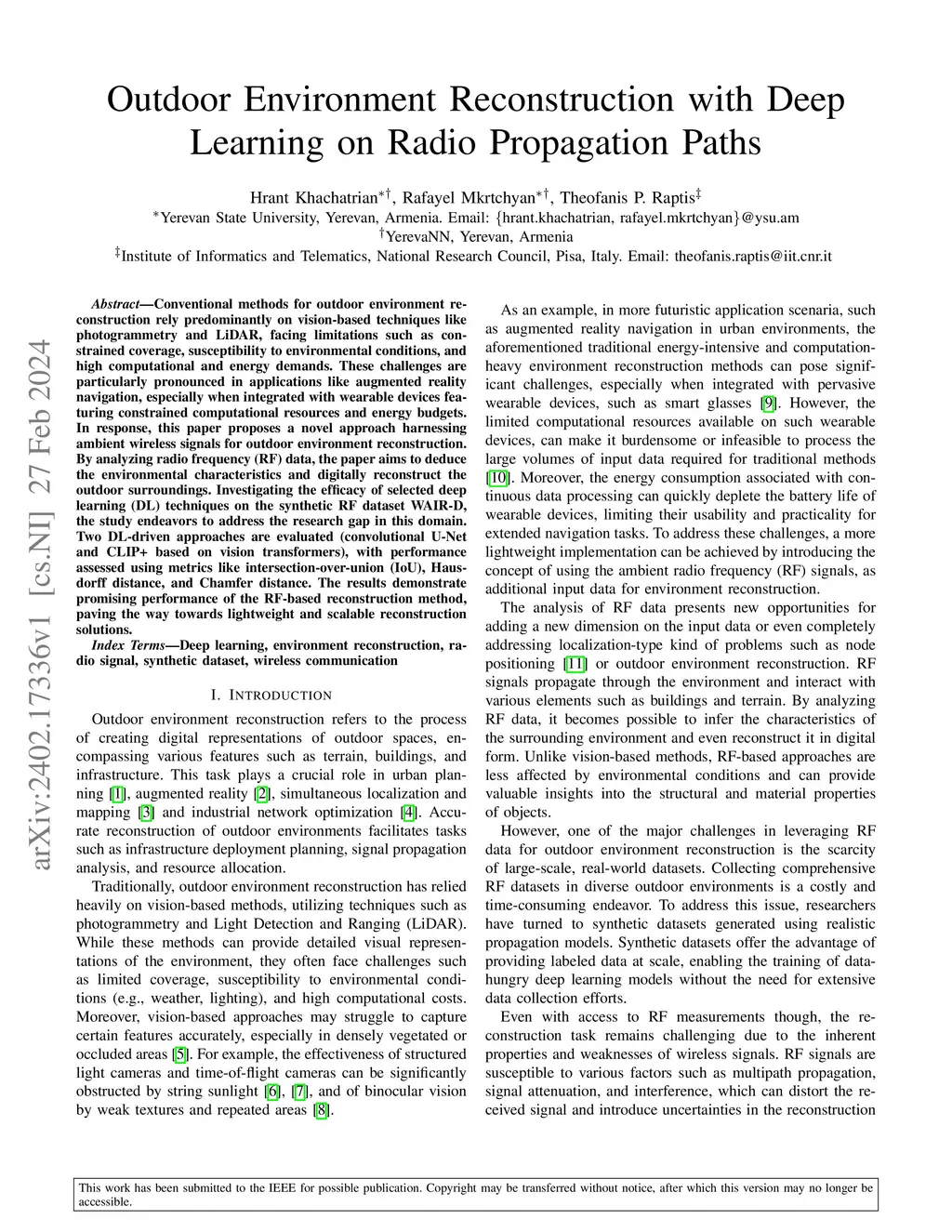 Conventional methods for outdoor environment reconstruction rely predominantly on vision-based techniques like photogrammetry and LiDAR, facing limitations such as constrained coverage, susceptibility to environmental conditions, and high computational and energy demands. These challenges are particularly pronounced in applications like augmented reality navigation, especially when integrated with wearable devices featuring constrained computational resources and energy budgets. In response, this paper proposes a novel approach harnessing ambient wireless signals for outdoor environment reconstruction. By analyzing radio frequency (RF) data, the paper aims to deduce the environmental characteristics and digitally reconstruct the outdoor surroundings. Investigating the efficacy of selected deep learning (DL) techniques on the synthetic RF dataset WAIR-D, the study endeavors to address the research gap in this domain. Two DL-driven approaches are evaluated (convolutional U-Net and CLIP+ based on vision transformers), with performance assessed using metrics like intersection-over-union (IoU), Hausdorff distance, and Chamfer distance. The results demonstrate promising performance of the RF-based reconstruction method, paving the way towards lightweight and scalable reconstruction solutions.