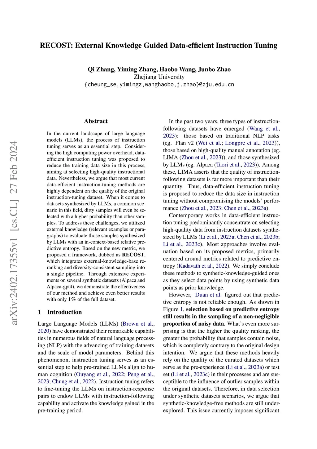 RECOST: External Knowledge Guided Data-efficient Instruction Tuning