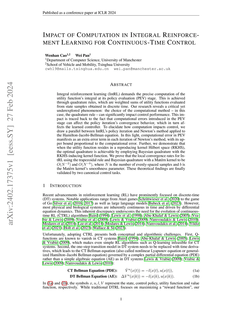 Integral reinforcement learning (IntRL) demands the precise computation of the utility function's integral at its policy evaluation (PEV) stage. This is achieved through quadrature rules, which are weighted sums of utility functions evaluated from state samples obtained in discrete time. Our research reveals a critical yet underexplored phenomenon: the choice of the computational method -- in this case, the quadrature rule -- can significantly impact control performance. This impact is traced back to the fact that computational errors introduced in the PEV stage can affect the policy iteration's convergence behavior, which in turn affects the learned controller. To elucidate how computation impacts control, we draw a parallel between IntRL's policy iteration and Newton's method applied to the Hamilton-Jacobi-Bellman equation. In this light, computational error in PEV manifests as an extra error term in each iteration of Newton's method, with its upper bound proportional to the computational error. Further, we demonstrate that when the utility function resides in a reproducing kernel Hilbert space (RKHS), the optimal quadrature is achievable by employing Bayesian quadrature with the RKHS-inducing kernel function. We prove that the local convergence rates for IntRL using the trapezoidal rule and Bayesian quadrature with a Mat\érn kernel to be and , where is the number of evenly-spaced samples and is the Mat\érn kernel's smoothness parameter. These theoretical findings are finally validated by two canonical control tasks.