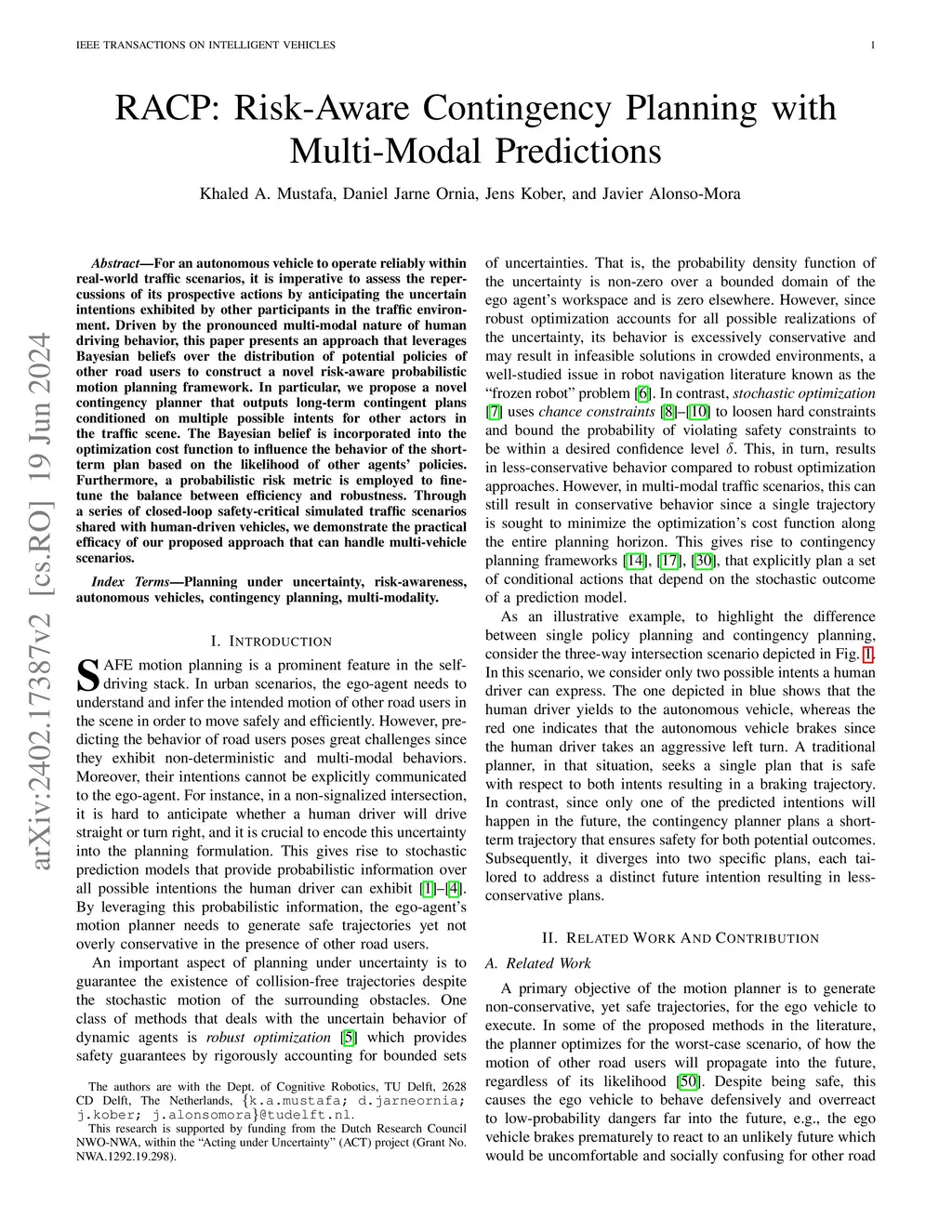 For an autonomous vehicle to operate reliably within real-world traffic scenarios, it is imperative to assess the repercussions of its prospective actions by anticipating the uncertain intentions exhibited by other participants in the traffic environment. Driven by the pronounced multi-modal nature of human driving behavior, this paper presents an approach that leverages Bayesian beliefs over the distribution of potential policies of other road users to construct a novel risk-aware probabilistic motion planning framework. In particular, we propose a novel contingency planner that outputs long-term contingent plans conditioned on multiple possible intents for other actors in the traffic scene. The Bayesian belief is incorporated into the optimization cost function to influence the behavior of the short-term plan based on the likelihood of other agents' policies. Furthermore, a probabilistic risk metric is employed to fine-tune the balance between efficiency and robustness. Through a series of closed-loop safety-critical simulated traffic scenarios shared with human-driven vehicles, we demonstrate the practical efficacy of our proposed approach that can handle multi-vehicle scenarios.