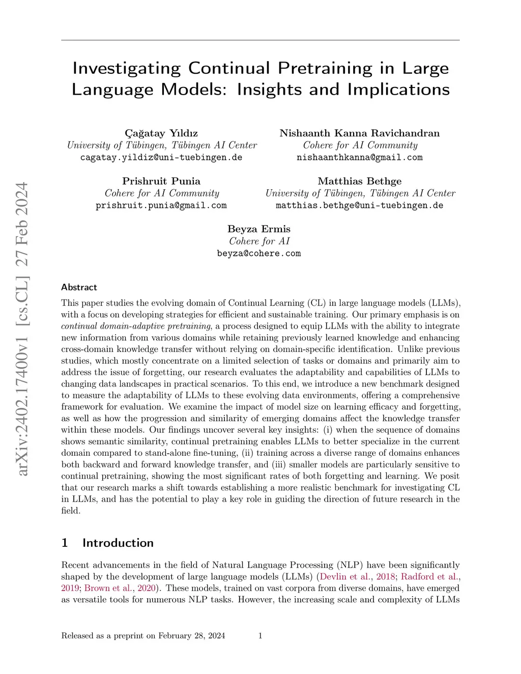 Continual learning (CL) in large language models (LLMs) is an evolving domain that focuses on developing efficient and sustainable training strategies to adapt models to emerging knowledge and achieve robustness in dynamic environments. Our primary emphasis is on continual domain-adaptive pretraining, a process designed to equip LLMs with the ability to integrate new information from various domains while retaining previously learned knowledge. Since existing works concentrate mostly on continual fine-tuning for a limited selection of downstream tasks or training domains, we introduce a new benchmark designed to measure the adaptability of LLMs to changing pretraining data landscapes. We further examine the impact of model size on learning efficacy and forgetting, as well as how the progression and similarity of emerging domains affect the knowledge transfer within these models.Our findings uncover several key insights: (i) continual pretraining consistently improves <1.5B models studied in this work and is also superior to domain adaptation, (ii) larger models always achieve better perplexity than smaller ones when continually pretrained on the same corpus, (iii) smaller models are particularly sensitive to continual pretraining, showing the most significant rates of both learning and forgetting, (iv) continual pretraining boosts downstream task performance of GPT-2 family, (v) continual pretraining enables LLMs to specialize better when the sequence of domains shows semantic similarity while randomizing training domains leads to better transfer and final performance otherwise. We posit that our research establishes a new benchmark for CL in LLMs, providing a more realistic evaluation of knowledge retention and transfer across diverse domains.