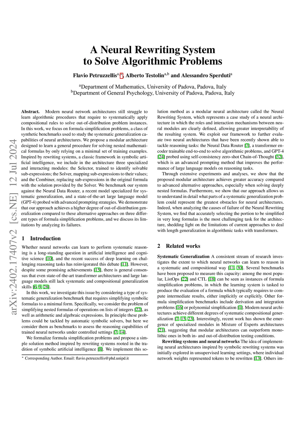 Modern neural network architectures still struggle to learn algorithmic procedures that require to systematically apply compositional rules to solve out-of-distribution problem instances. In this work, we focus on formula simplification problems, a class of synthetic benchmarks used to study the systematic generalization capabilities of neural architectures. We propose a modular architecture designed to learn a general procedure for solving nested mathematical formulas by only relying on a minimal set of training examples. Inspired by rewriting systems, a classic framework in symbolic artificial intelligence, we include in the architecture three specialized and interacting modules: the Selector, trained to identify solvable sub-expressions; the Solver, mapping sub-expressions to their values; and the Combiner, replacing sub-expressions in the original formula with the solution provided by the Solver. We benchmark our system against the Neural Data Router, a recent model specialized for systematic generalization, and a state-of-the-art large language model (GPT-4) probed with advanced prompting strategies. We demonstrate that our approach achieves a higher degree of out-of-distribution generalization compared to these alternative approaches on three different types of formula simplification problems, and we discuss its limitations by analyzing its failures.