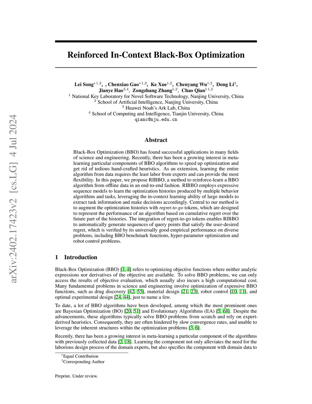Black-Box Optimization (BBO) has found successful applications in many fields of science and engineering. Recently, there has been a growing interest in meta-learning particular components of BBO algorithms to speed up optimization and get rid of tedious hand-crafted heuristics. As an extension, learning the entire algorithm from data requires the least labor from experts and can provide the most flexibility. In this paper, we propose RIBBO, a method to reinforce-learn a BBO algorithm from offline data in an end-to-end fashion. RIBBO employs expressive sequence models to learn the optimization histories produced by multiple behavior algorithms and tasks, leveraging the in-context learning ability of large models to extract task information and make decisions accordingly. Central to our method is to augment the optimization histories with \textit{regret-to-go} tokens, which are designed to represent the performance of an algorithm based on cumulative regret over the future part of the histories. The integration of regret-to-go tokens enables RIBBO to automatically generate sequences of query points that satisfy the user-desired regret, which is verified by its universally good empirical performance on diverse problems, including BBO benchmark functions, hyper-parameter optimization and robot control problems.
