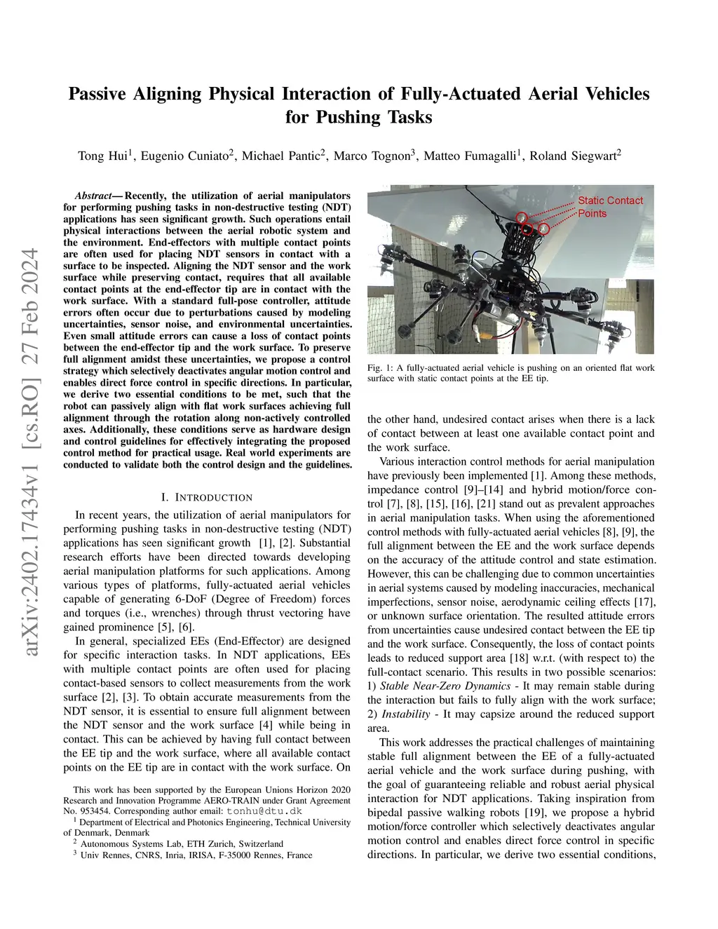 Recently, the utilization of aerial manipulators for performing pushing tasks in non-destructive testing (NDT) applications has seen significant growth. Such operations entail physical interactions between the aerial robotic system and the environment. End-effectors with multiple contact points are often used for placing NDT sensors in contact with a surface to be inspected. Aligning the NDT sensor and the work surface while preserving contact, requires that all available contact points at the end-effector tip are in contact with the work surface. With a standard full-pose controller, attitude errors often occur due to perturbations caused by modeling uncertainties, sensor noise, and environmental uncertainties. Even small attitude errors can cause a loss of contact points between the end-effector tip and the work surface. To preserve full alignment amidst these uncertainties, we propose a control strategy which selectively deactivates angular motion control and enables direct force control in specific directions. In particular, we derive two essential conditions to be met, such that the robot can passively align with flat work surfaces achieving full alignment through the rotation along non-actively controlled axes. Additionally, these conditions serve as hardware design and control guidelines for effectively integrating the proposed control method for practical usage. Real world experiments are conducted to validate both the control design and the guidelines.