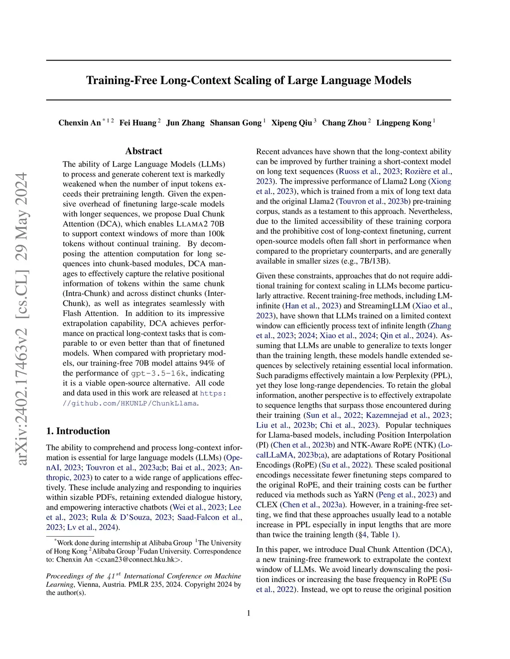 The ability of Large Language Models (LLMs) to process and generate coherent text is markedly weakened when the number of input tokens exceeds their pretraining length. Given the expensive overhead of finetuning large-scale models with longer sequences, we propose Dual Chunk Attention (DCA), which enables Llama2 70B to support context windows of more than 100k tokens without continual training. By decomposing the attention computation for long sequences into chunk-based modules, DCA manages to effectively capture the relative positional information of tokens within the same chunk (Intra-Chunk) and across distinct chunks (Inter-Chunk), as well as integrates seamlessly with Flash Attention. In addition to its impressive extrapolation capability, DCA achieves performance on practical long-context tasks that is comparable to or even better than that of finetuned models. When compared with proprietary models, our training-free 70B model attains 94% of the performance of gpt-3.5-16k, indicating it is a viable open-source alternative. All code and data used in this work are released at \url{https://github.com/HKUNLP/ChunkLlama}.