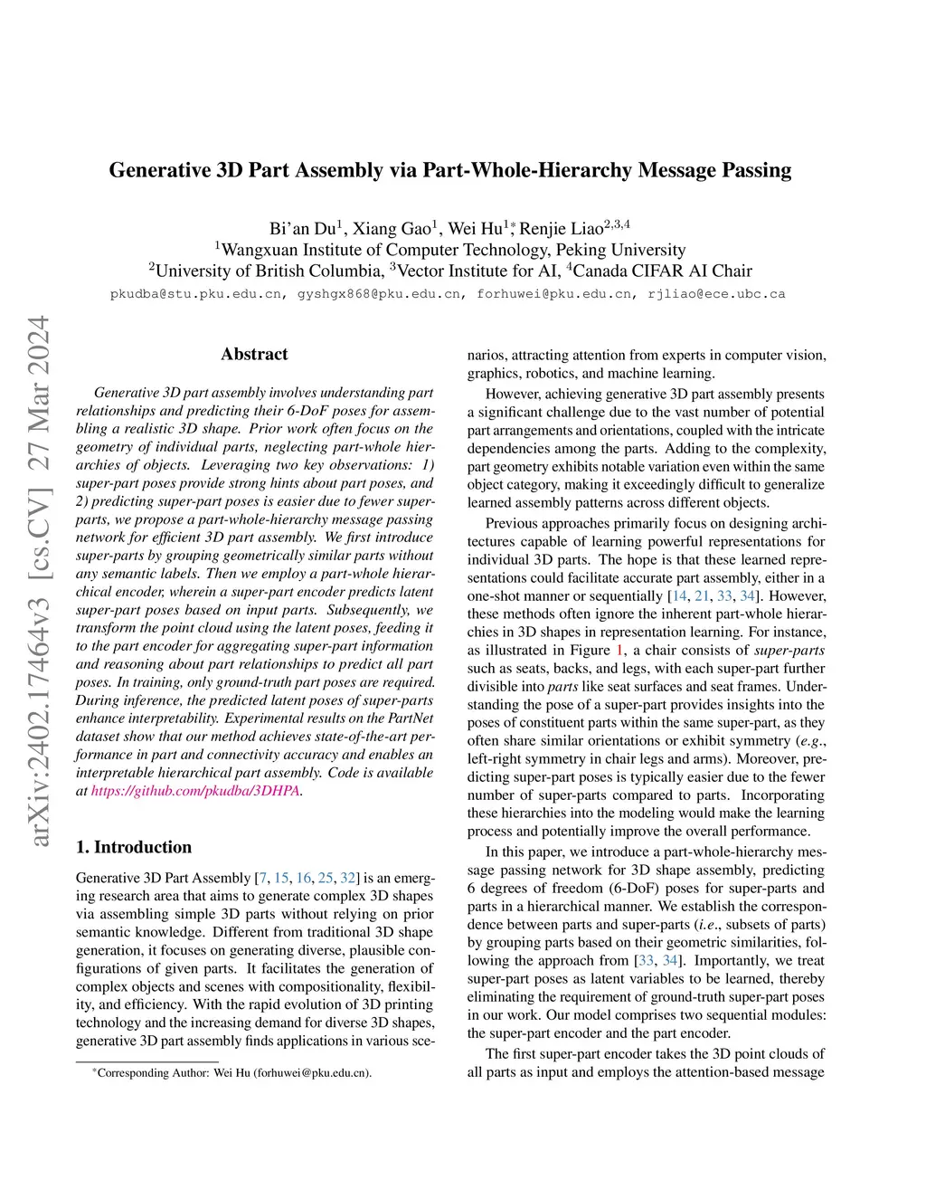 Generative 3D part assembly involves understanding part relationships and predicting their 6-DoF poses for assembling a realistic 3D shape. Prior work often focus on the geometry of individual parts, neglecting part-whole hierarchies of objects. Leveraging two key observations: 1) super-part poses provide strong hints about part poses, and 2) predicting super-part poses is easier due to fewer superparts, we propose a part-whole-hierarchy message passing network for efficient 3D part assembly. We first introduce super-parts by grouping geometrically similar parts without any semantic labels. Then we employ a part-whole hierarchical encoder, wherein a super-part encoder predicts latent super-part poses based on input parts. Subsequently, we transform the point cloud using the latent poses, feeding it to the part encoder for aggregating super-part information and reasoning about part relationships to predict all part poses. In training, only ground-truth part poses are required. During inference, the predicted latent poses of super-parts enhance interpretability. Experimental results on the PartNet dataset show that our method achieves state-of-the-art performance in part and connectivity accuracy and enables an interpretable hierarchical part assembly. Code is available at https://github.com/pkudba/3DHPA.