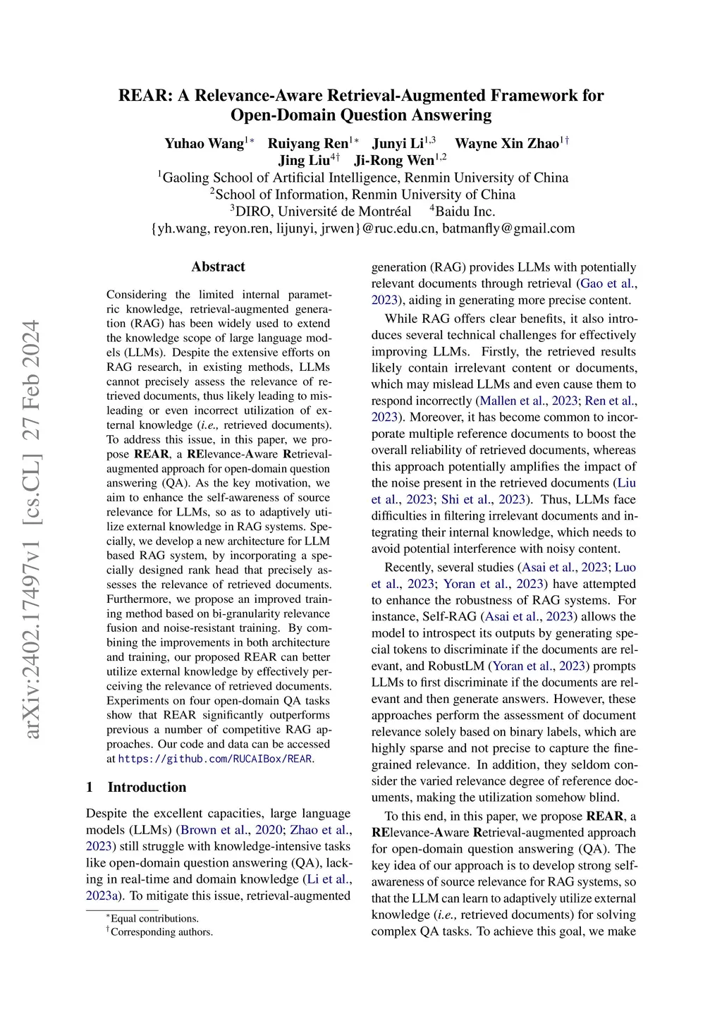 REAR: A Relevance-Aware Retrieval-Augmented Framework for Open-Domain