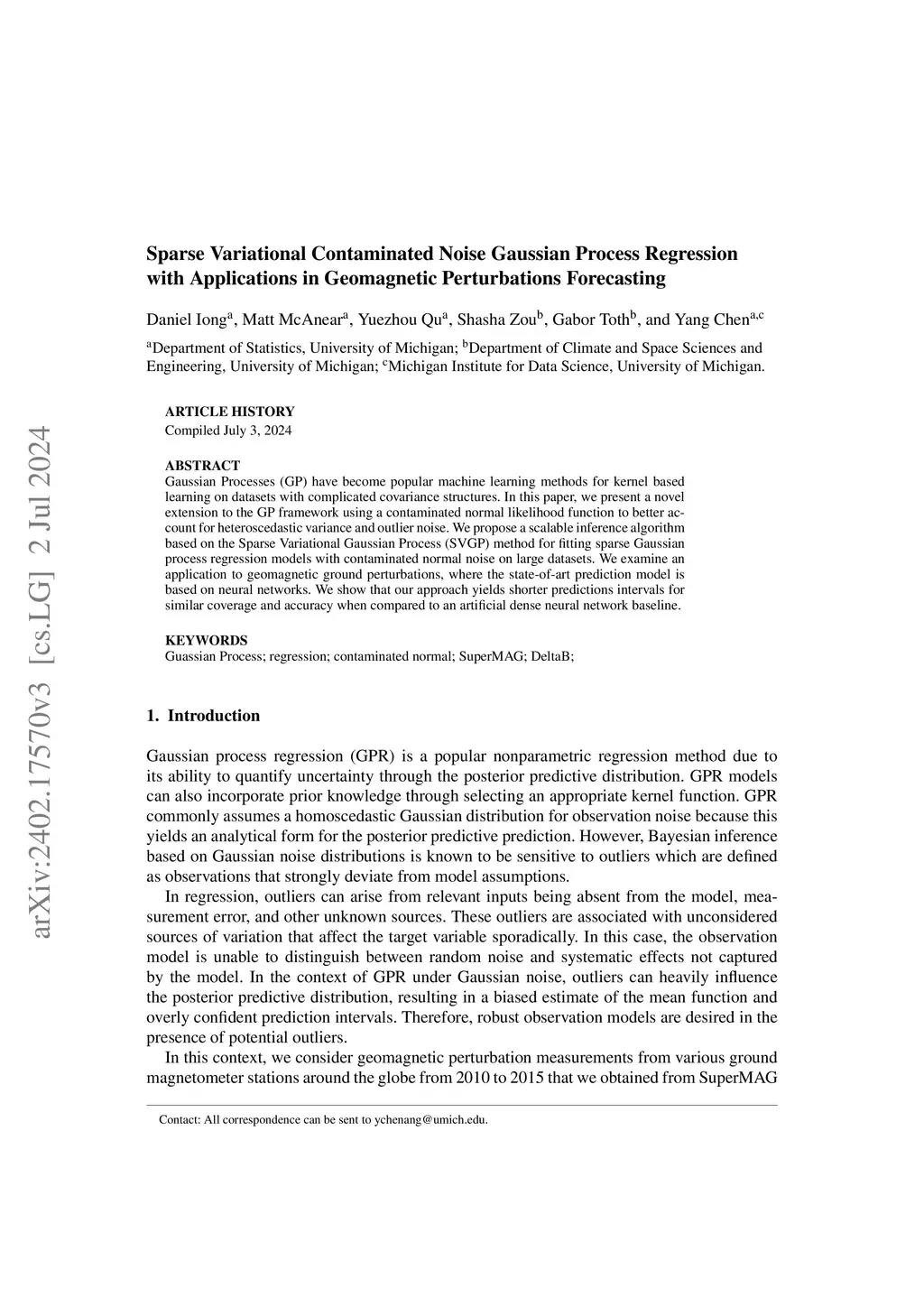 Gaussian Processes (GP) have become popular machine-learning methods for kernel-based learning on datasets with complicated covariance structures. In this paper, we present a novel extension to the GP framework using a contaminated normal likelihood function to better account for heteroscedastic variance and outlier noise. We propose a scalable inference algorithm based on the Sparse Variational Gaussian Process (SVGP) method for fitting sparse Gaussian process regression models with contaminated normal noise on large datasets. We examine an application to geomagnetic ground perturbations, where the state-of-the-art prediction model is based on neural networks. We show that our approach yields shorter prediction intervals for similar coverage and accuracy when compared to an artificial dense neural network baseline.