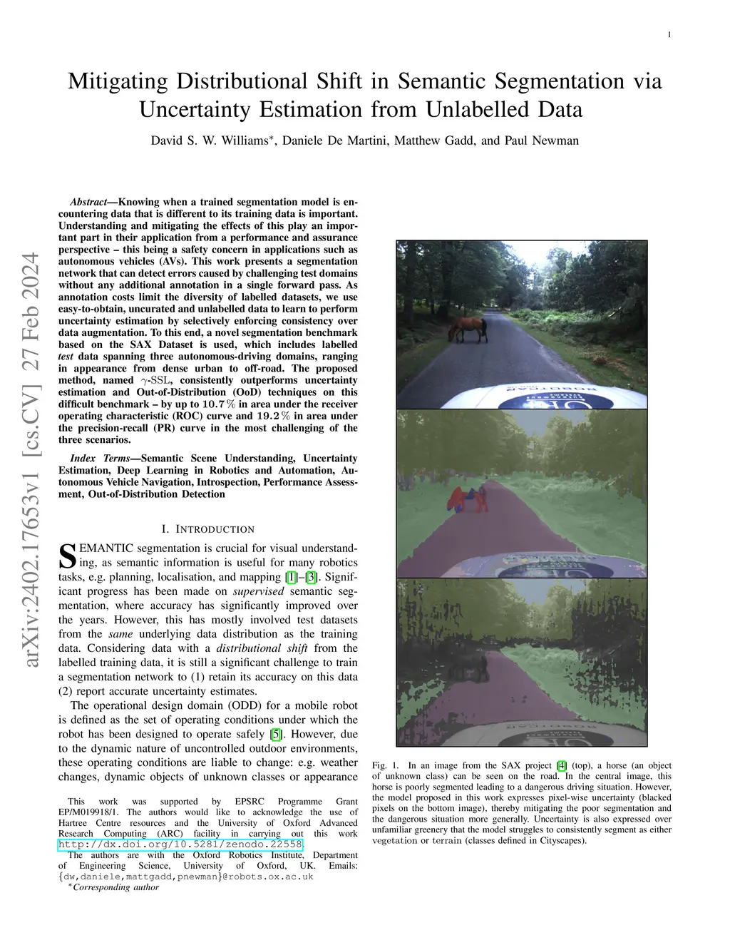 Knowing when a trained segmentation model is encountering data that is different to its training data is important. Understanding and mitigating the effects of this play an important part in their application from a performance and assurance perspective - this being a safety concern in applications such as autonomous vehicles (AVs). This work presents a segmentation network that can detect errors caused by challenging test domains without any additional annotation in a single forward pass. As annotation costs limit the diversity of labelled datasets, we use easy-to-obtain, uncurated and unlabelled data to learn to perform uncertainty estimation by selectively enforcing consistency over data augmentation. To this end, a novel segmentation benchmark based on the SAX Dataset is used, which includes labelled test data spanning three autonomous-driving domains, ranging in appearance from dense urban to off-road. The proposed method, named Gamma-SSL, consistently outperforms uncertainty estimation and Out-of-Distribution (OoD) techniques on this difficult benchmark - by up to 10.7% in area under the receiver operating characteristic (ROC) curve and 19.2% in area under the precision-recall (PR) curve in the most challenging of the three scenarios.