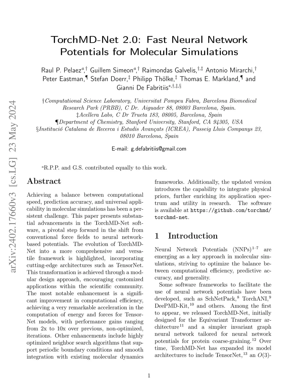 Achieving a balance between computational speed, prediction accuracy, and universal applicability in molecular simulations has been a persistent challenge. This paper presents substantial advancements in the TorchMD-Net software, a pivotal step forward in the shift from conventional force fields to neural network-based potentials. The evolution of TorchMD-Net into a more comprehensive and versatile framework is highlighted, incorporating cutting-edge architectures such as TensorNet. This transformation is achieved through a modular design approach, encouraging customized applications within the scientific community. The most notable enhancement is a significant improvement in computational efficiency, achieving a very remarkable acceleration in the computation of energy and forces for TensorNet models, with performance gains ranging from 2-fold to 10-fold over previous iterations. Other enhancements include highly optimized neighbor search algorithms that support periodic boundary conditions and the smooth integration with existing molecular dynamics frameworks. Additionally, the updated version introduces the capability to integrate physical priors, further enriching its application spectrum and utility in research. The software is available at https://github.com/torchmd/torchmd-net.