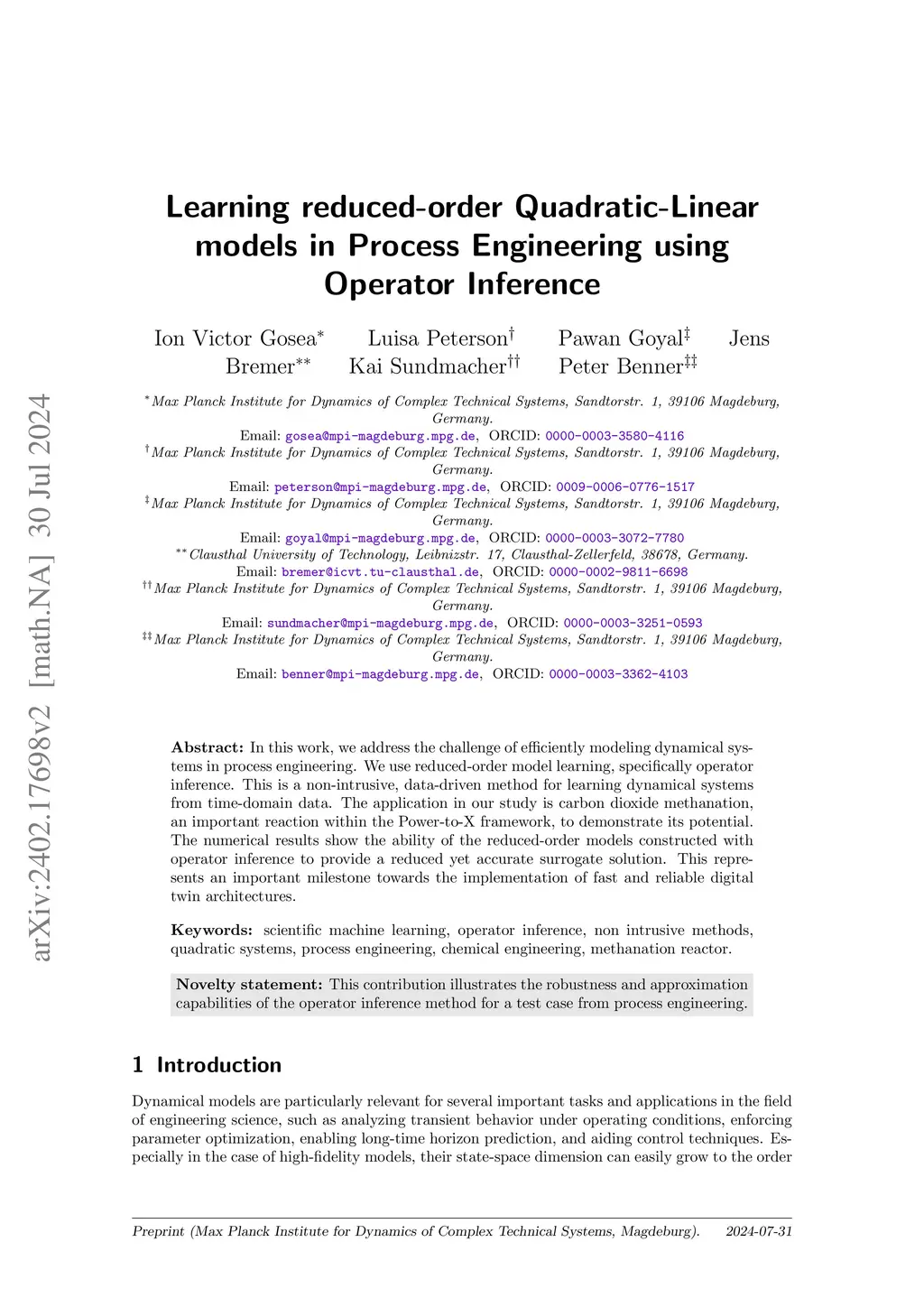 In this work, we address the challenge of efficiently modeling dynamical systems in process engineering. We use reduced-order model learning, specifically operator inference. This is a non-intrusive, data-driven method for learning dynamical systems from time-domain data. The application in our study is carbon dioxide methanation, an important reaction within the Power-to-X framework, to demonstrate its potential. The numerical results show the ability of the reduced-order models constructed with operator inference to provide a reduced yet accurate surrogate solution. This represents an important milestone towards the implementation of fast and reliable digital twin architectures.