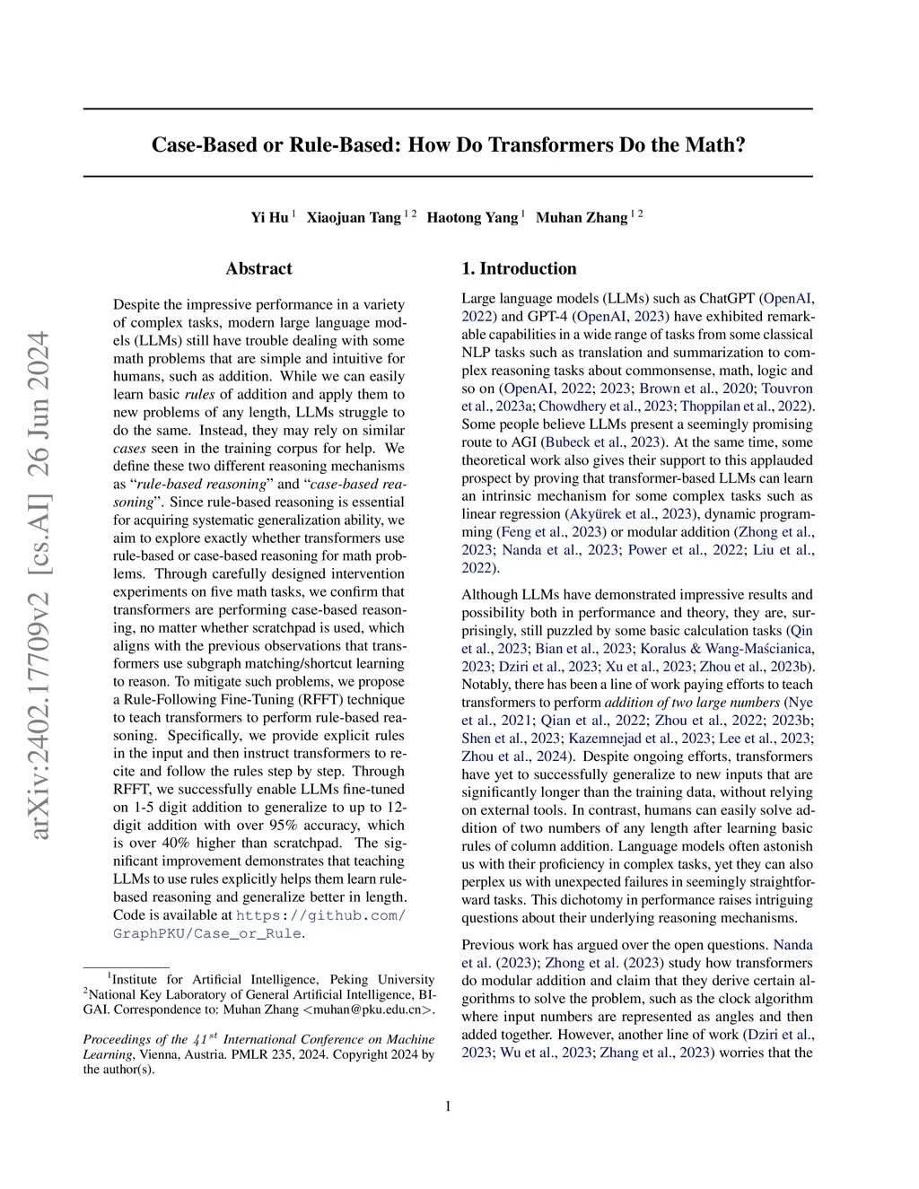 Despite the impressive performance in a variety of complex tasks, modern large language models (LLMs) still have trouble dealing with some math problems that are simple and intuitive for humans, such as addition. While we can easily learn basic rules of addition and apply them to new problems of any length, LLMs struggle to do the same. Instead, they may rely on similar cases seen in the training corpus for help. We define these two different reasoning mechanisms as "rule-based reasoning" and "case-based reasoning". Since rule-based reasoning is essential for acquiring systematic generalization ability, we aim to explore exactly whether transformers use rule-based or case-based reasoning for math problems. Through carefully designed intervention experiments on five math tasks, we confirm that transformers are performing case-based reasoning, no matter whether scratchpad is used, which aligns with the previous observations that transformers use subgraph matching/shortcut learning to reason. To mitigate such problems, we propose a Rule-Following Fine-Tuning (RFFT) technique to teach transformers to perform rule-based reasoning. Specifically, we provide explicit rules in the input and then instruct transformers to recite and follow the rules step by step. Through RFFT, we successfully enable LLMs fine-tuned on 1-5 digit addition to generalize to up to 12-digit addition with over 95% accuracy, which is over 40% higher than scratchpad. The significant improvement demonstrates that teaching LLMs to use rules explicitly helps them learn rule-based reasoning and generalize better in length.