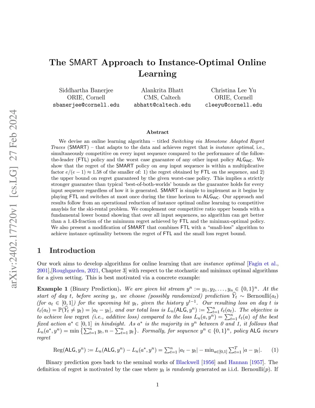 We devise an online learning algorithm -- titled Switching via Monotone Adapted Regret Traces (SMART) -- that adapts to the data and achieves regret that is instance optimal, i.e., simultaneously competitive on every input sequence compared to the performance of the follow-the-leader (FTL) policy and the worst case guarantee of any other input policy. We show that the regret of the SMART policy on any input sequence is within a multiplicative factor of the smaller of: 1) the regret obtained by FTL on the sequence, and 2) the upper bound on regret guaranteed by the given worst-case policy. This implies a strictly stronger guarantee than typical `best-of-both-worlds' bounds as the guarantee holds for every input sequence regardless of how it is generated. SMART is simple to implement as it begins by playing FTL and switches at most once during the time horizon to the worst-case algorithm. Our approach and results follow from an operational reduction of instance optimal online learning to competitive analysis for the ski-rental problem. We complement our competitive ratio upper bounds with a fundamental lower bound showing that over all input sequences, no algorithm can get better than a -fraction of the minimum regret achieved by FTL and the minimax-optimal policy. We also present a modification of SMART that combines FTL with a ``small-loss" algorithm to achieve instance optimality between the regret of FTL and the small loss regret bound.
