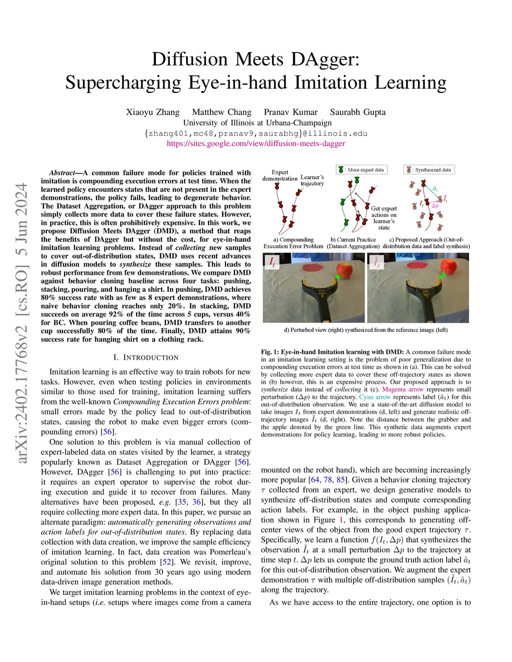 A common failure mode for policies trained with imitation is compounding execution errors at test time. When the learned policy encounters states that are not present in the expert demonstrations, the policy fails, leading to degenerate behavior. The Dataset Aggregation, or DAgger approach to this problem simply collects more data to cover these failure states. However, in practice, this is often prohibitively expensive. In this work, we propose Diffusion Meets DAgger (DMD), a method to reap the benefits of DAgger without the cost for eye-in-hand imitation learning problems. Instead of collecting new samples to cover out-of-distribution states, DMD uses recent advances in diffusion models to synthesize these samples. This leads to robust performance from few demonstrations. We compare DMD against behavior cloning baseline across four tasks: pushing, stacking, pouring, and shirt hanging. In pushing, DMD achieves 80% success rate with as few as 8 expert demonstrations, where naive behavior cloning reaches only 20%. In stacking, DMD succeeds on average 92% of the time across 5 cups, versus 40% for BC. When pouring coffee beans, DMD transfers to another cup successfully 80% of the time. Finally, DMD attains 90% success rate for hanging shirt on a clothing rack.