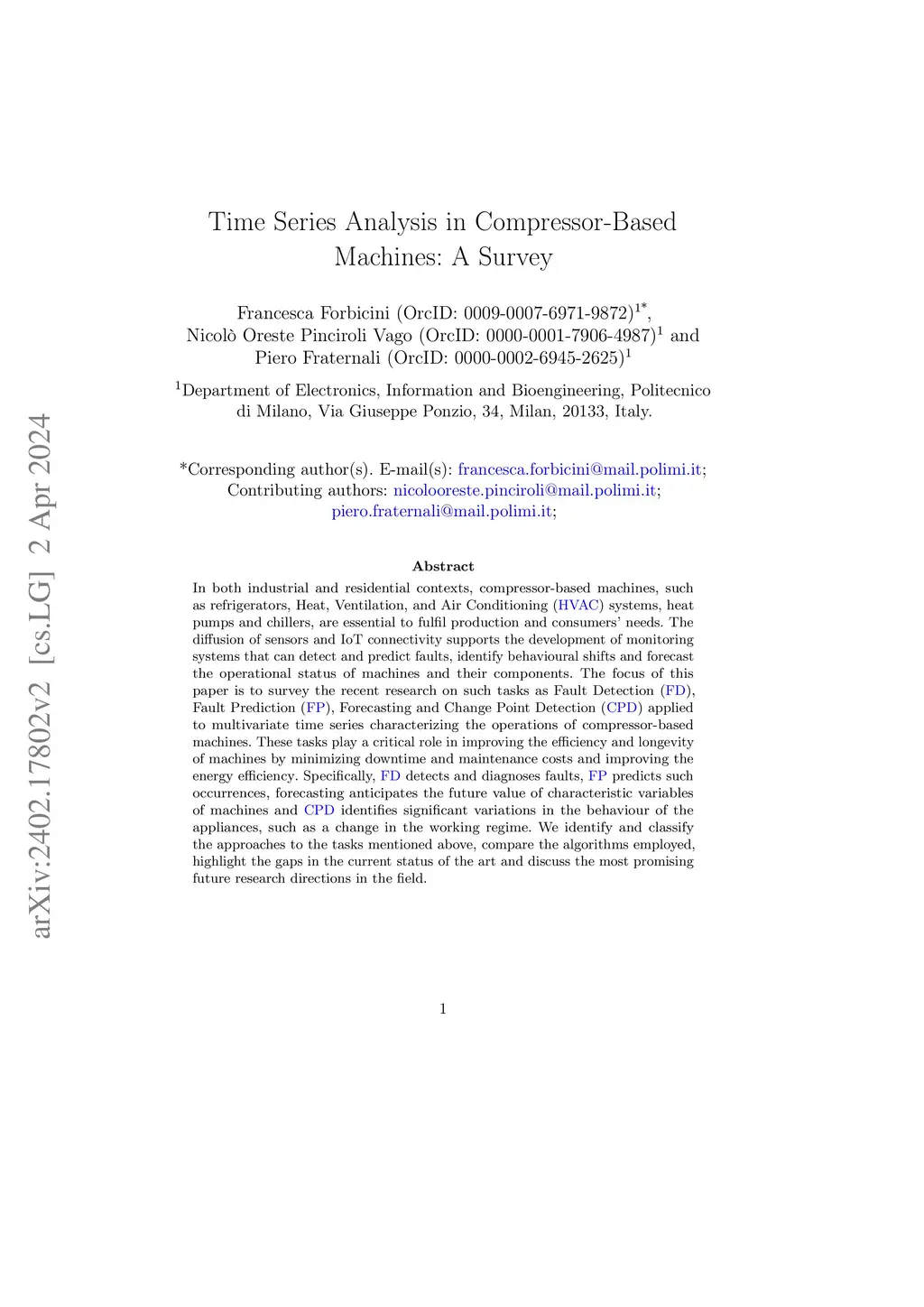 In both industrial and residential contexts, compressor-based machines, such as refrigerators, HVAC systems, heat pumps and chillers, are essential to fulfil production and consumers' needs. The diffusion of sensors and IoT connectivity supports the development of monitoring systems that can detect and predict faults, identify behavioural shifts and forecast the operational status of machines and their components. The focus of this paper is to survey the recent research on such tasks as FD, FP, Forecasting and CPD applied to multivariate time series characterizing the operations of compressor-based machines. These tasks play a critical role in improving the efficiency and longevity of machines by minimizing downtime and maintenance costs and improving the energy efficiency. Specifically, FD detects and diagnoses faults, FP predicts such occurrences, forecasting anticipates the future value of characteristic variables of machines and CPD identifies significant variations in the behaviour of the appliances, such as a change in the working regime. We identify and classify the approaches to the tasks mentioned above, compare the algorithms employed, highlight the gaps in the current status of the art and discuss the most promising future research directions in the field.