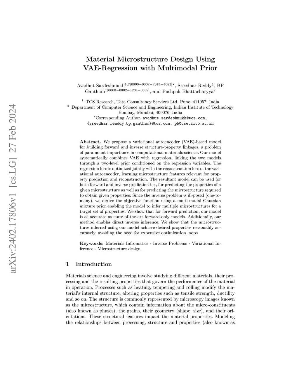 We propose a variational autoencoder (VAE)-based model for building forward and inverse structure-property linkages, a problem of paramount importance in computational materials science. Our model systematically combines VAE with regression, linking the two models through a two-level prior conditioned on the regression variables. The regression loss is optimized jointly with the reconstruction loss of the variational autoencoder, learning microstructure features relevant for property prediction and reconstruction. The resultant model can be used for both forward and inverse prediction i.e., for predicting the properties of a given microstructure as well as for predicting the microstructure required to obtain given properties. Since the inverse problem is ill-posed (one-to-many), we derive the objective function using a multi-modal Gaussian mixture prior enabling the model to infer multiple microstructures for a target set of properties. We show that for forward prediction, our model is as accurate as state-of-the-art forward-only models. Additionally, our method enables direct inverse inference. We show that the microstructures inferred using our model achieve desired properties reasonably accurately, avoiding the need for expensive optimization loops.
