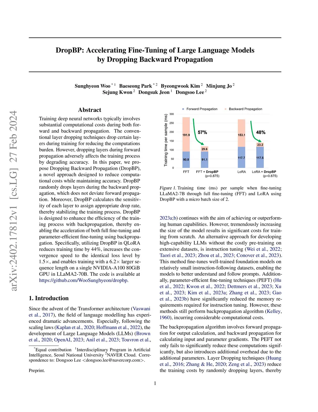 Large language models (LLMs) have achieved significant success across various domains. However, training these LLMs typically involves substantial memory and computational costs during both forward and backward propagation. While parameter-efficient fine-tuning (PEFT) considerably reduces the training memory associated with parameters, it does not address the significant computational costs and activation memory. In this paper, we propose Dropping Backward Propagation (DropBP), a novel approach designed to reduce computational costs and activation memory while maintaining accuracy. DropBP randomly drops layers during backward propagation, which is essentially equivalent to training shallow submodules generated by undropped layers and residual connections. Additionally, DropBP calculates the sensitivity of each layer to assign an appropriate drop rate, thereby stabilizing the training process. DropBP is not only applicable to full fine-tuning but can also be orthogonally integrated with all types of PEFT by dropping layers during backward propagation. Specifically, DropBP can reduce training time by 44% with comparable accuracy to the baseline, accelerate convergence to the same perplexity by 1.5x, and enable training with a sequence length 6.2x larger on a single NVIDIA-A100 GPU. Furthermore, our DropBP enabled a throughput increase of 79% on a NVIDIA A100 GPU and 117% on an Intel Gaudi2 HPU. The code is available atthis https URL.