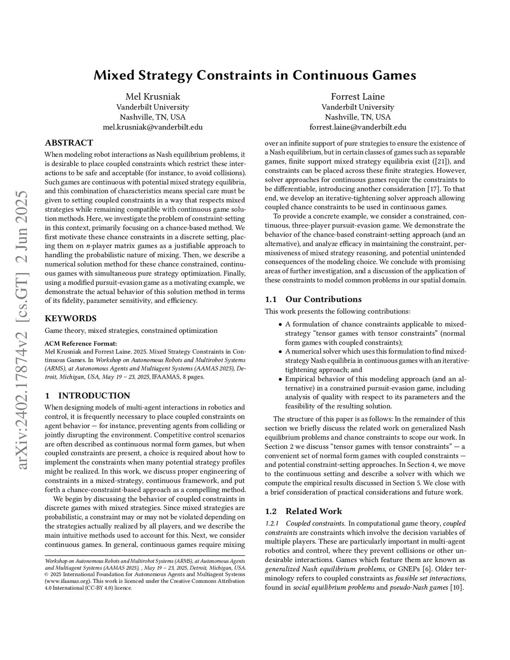 When modeling robot interactions as Nash equilibrium problems, it is desirable to place coupled constraints which restrict these interactions to be safe and acceptable (for instance, to avoid collisions). Such games are continuous with potential mixed strategy equilibria, and this combination of characteristics means special care must be given to setting coupled constraints in a way that respects mixed strategies while remaining compatible with continuous game solution methods. Here, we investigate the problem of constraint-setting in this context, primarily focusing on a chance-based method. We first motivate these chance constraints in a discrete setting, placing them on n-player matrix games as a justifiable approach to handling the probabilistic nature of mixing. Then, we describe a numerical solution method for these chance constrained, continuous games with simultaneous pure strategy optimization. Finally, using a modified pursuit-evasion game as a motivating example, we demonstrate the actual behavior of this solution method in terms of its fidelity, parameter sensitivity, and efficiency